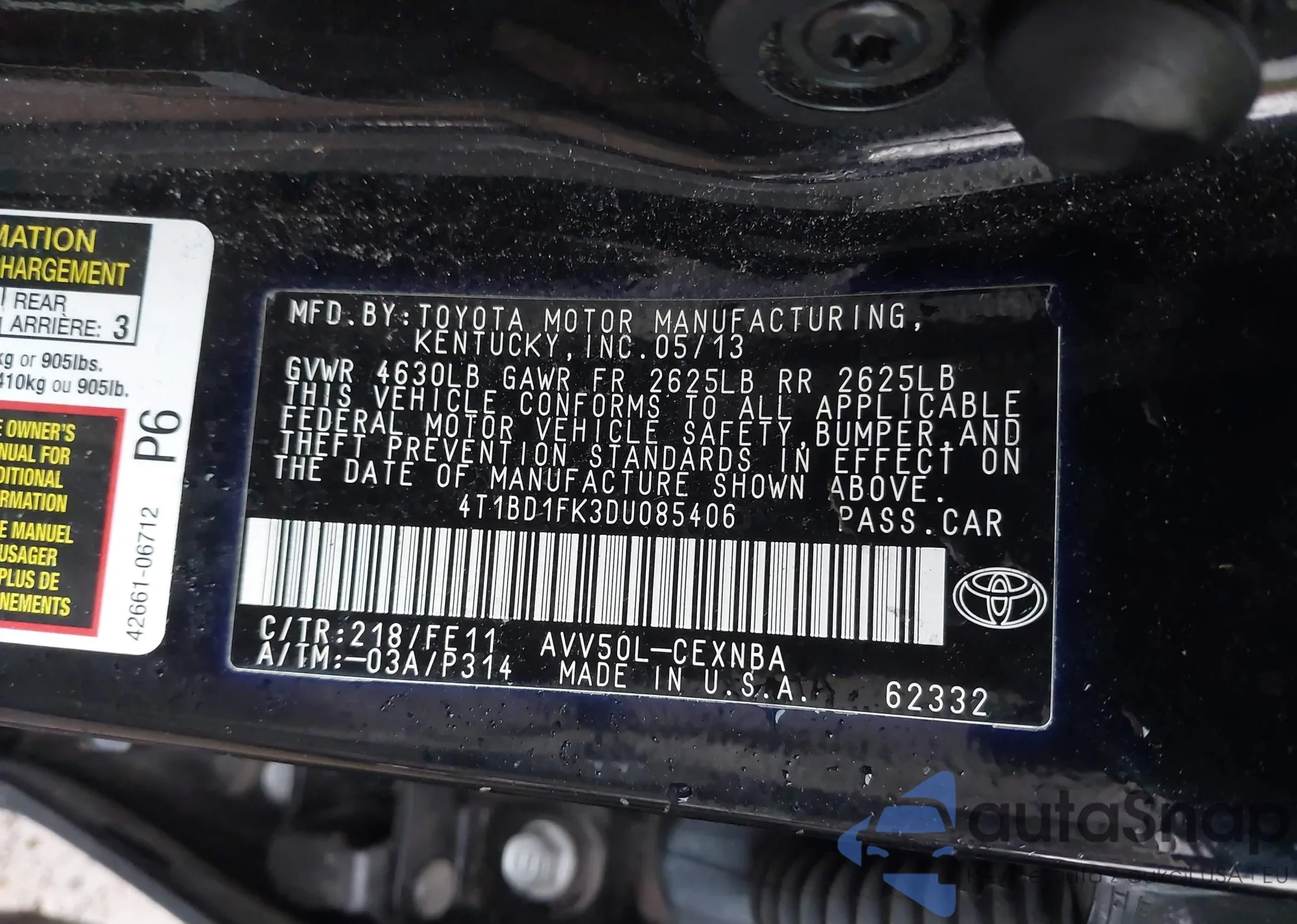 • VIN 4T1BD1FK3DU085406