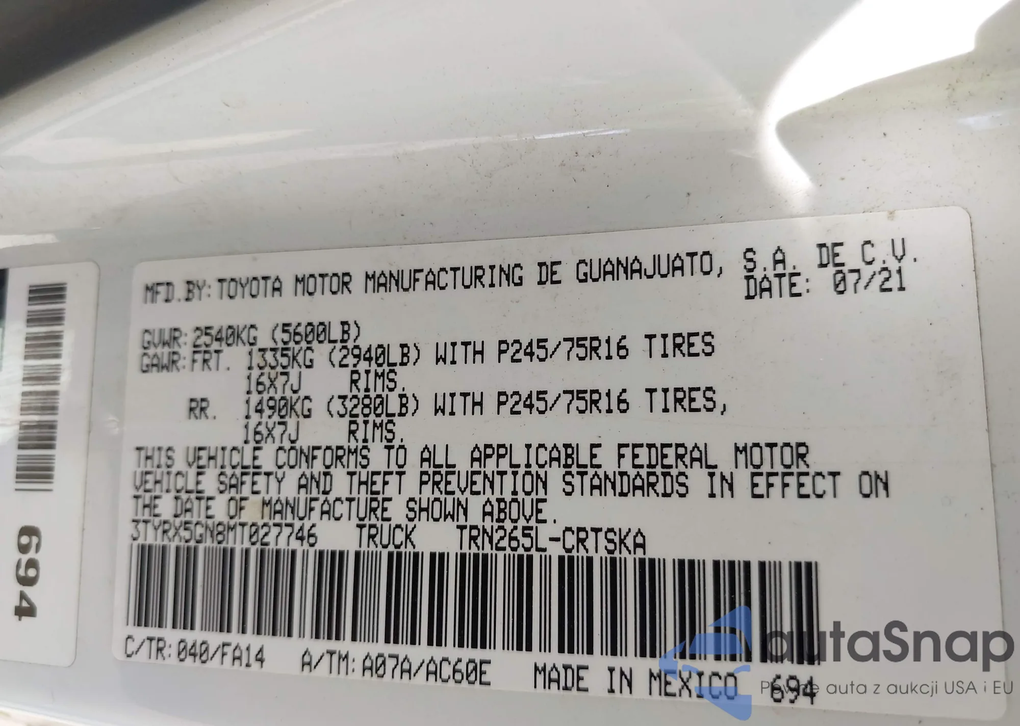 • VIN 3TYRX5GN8MT027746