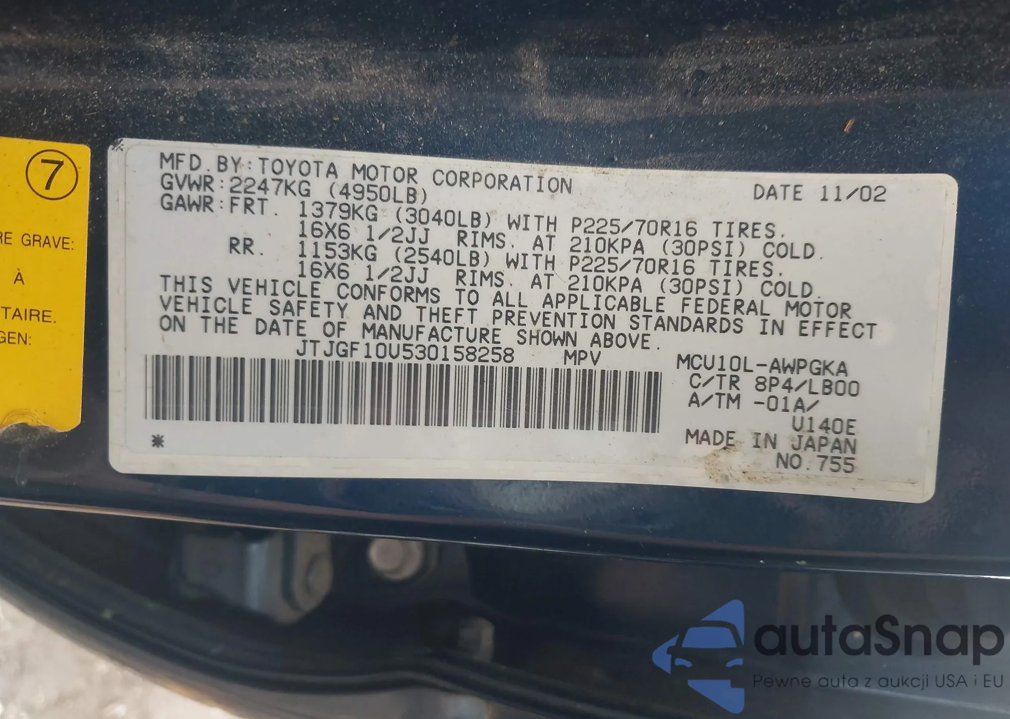 LOT: 41902002 VIN: JTJGF10U530158258