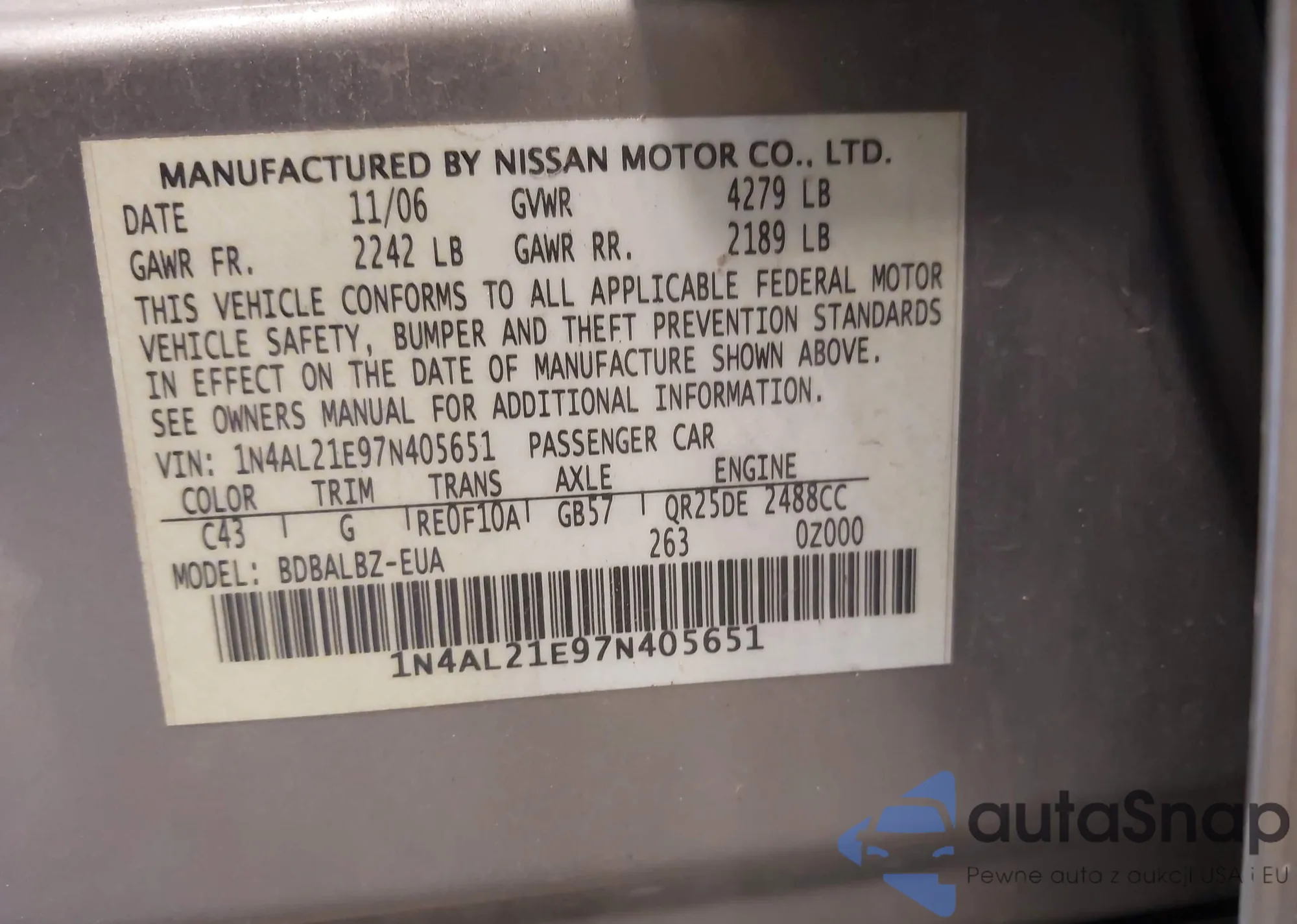 LOT: 43322963 VIN: 1N4AL21E97N405651