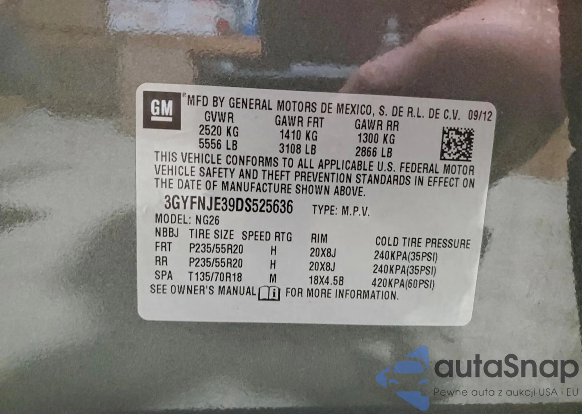 LOT: 95443655 VIN: 2G1WT57K291126411