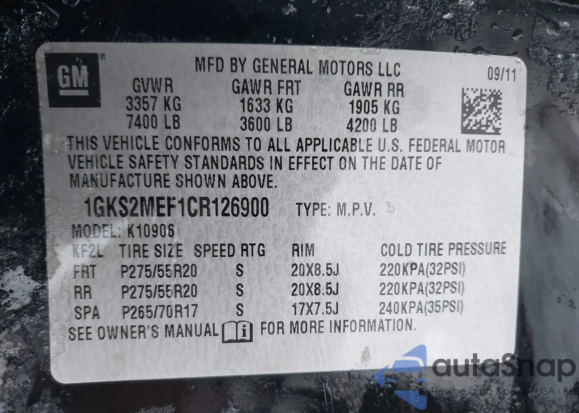 • VIN 1GKS2MEF1CR126900