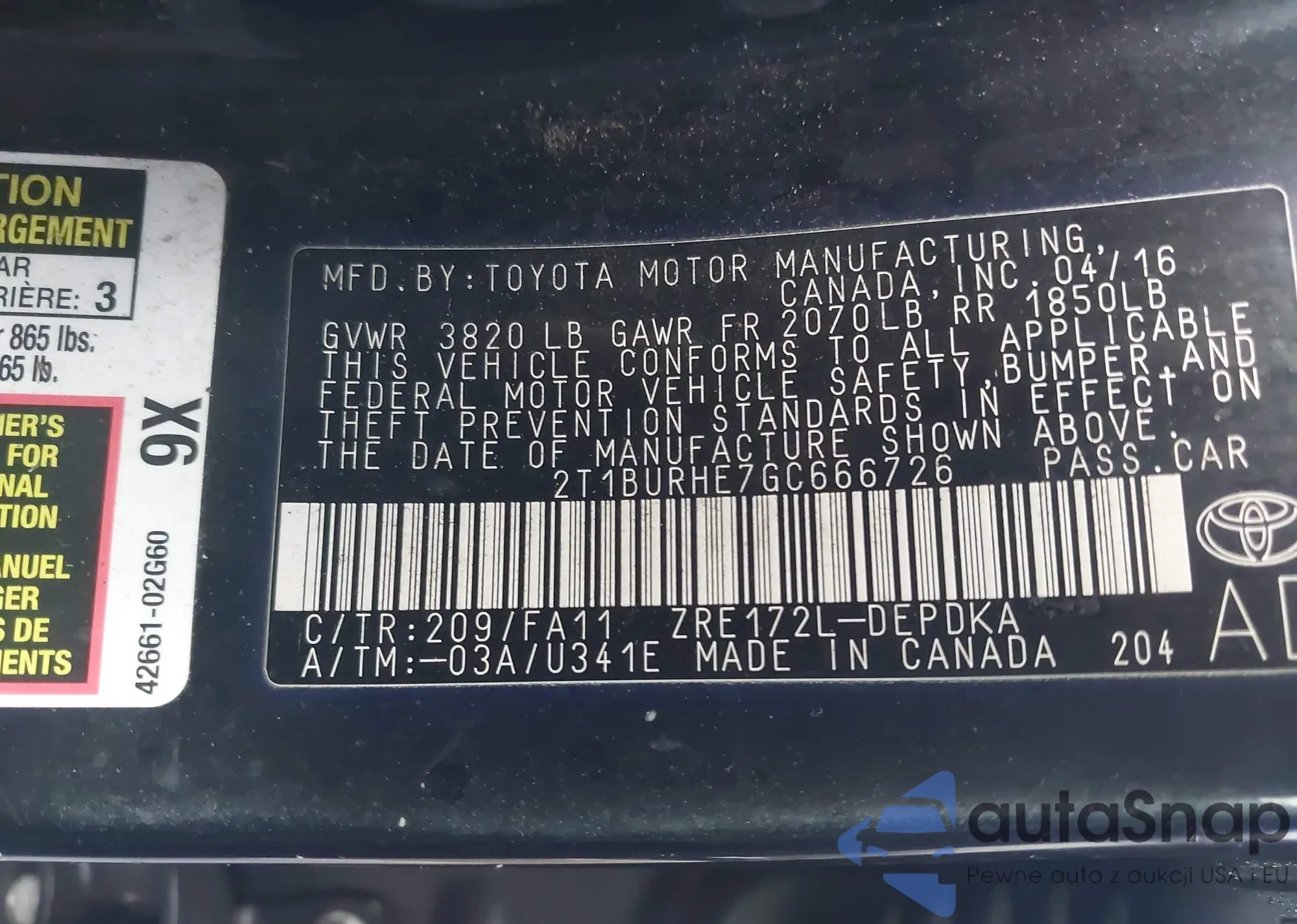 LOT: 43920253 VIN: 2T1BURHE7GC666726