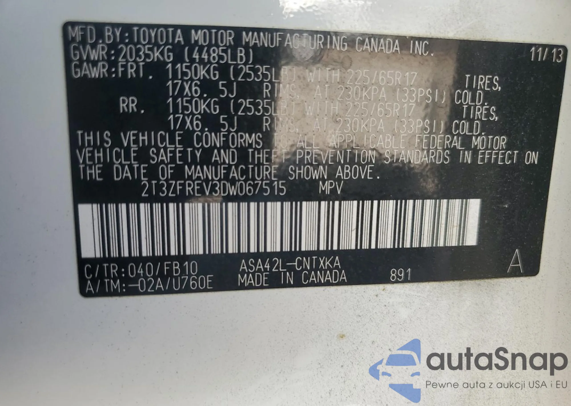 • VIN 2T3ZFREV3DW067515