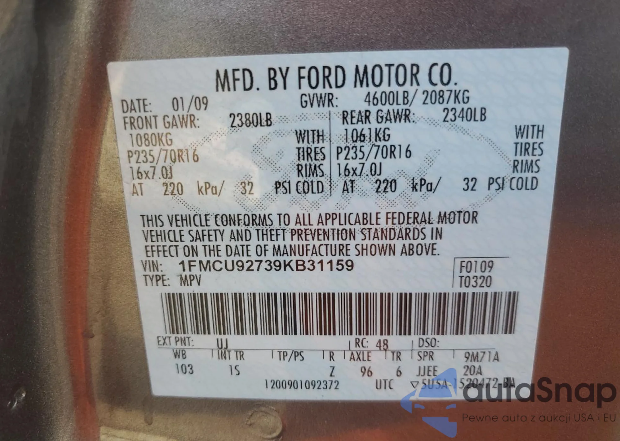 LOT: 91490345 VIN: 1FMCU92739KB31159