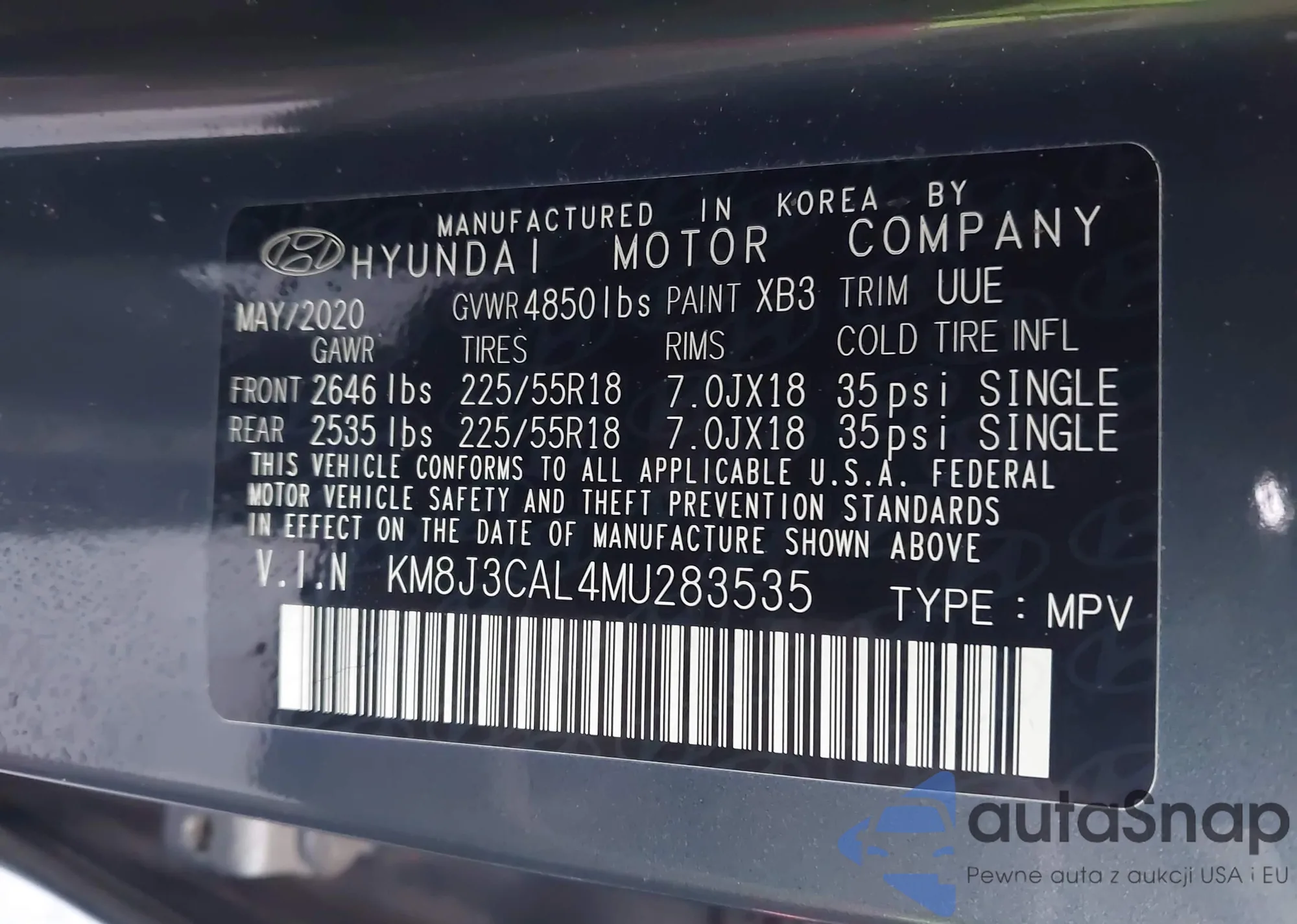 • VIN KM8J3CAL4MU283535
