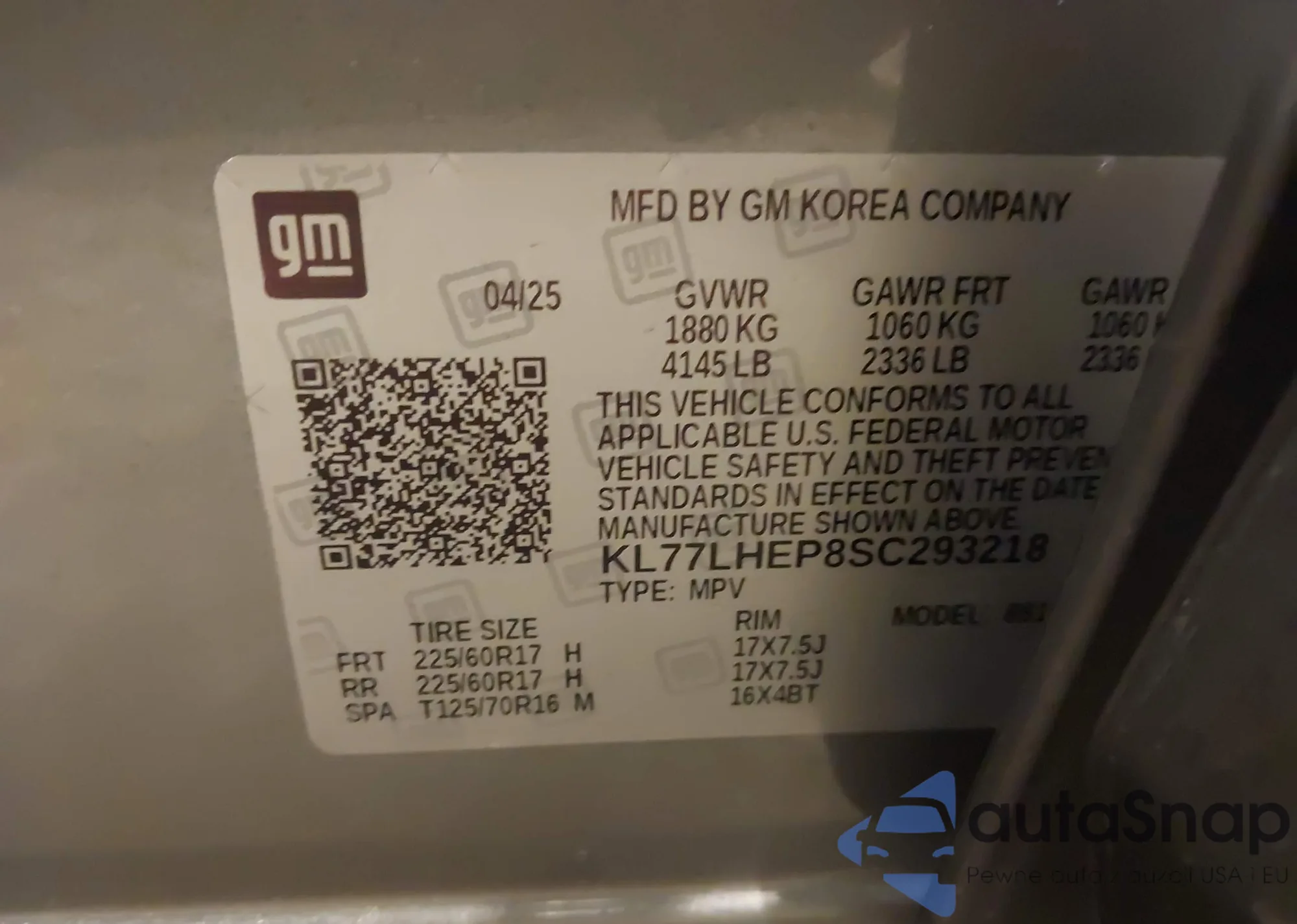 LOT: 43533707 VIN: KL77LHEP8SC293218