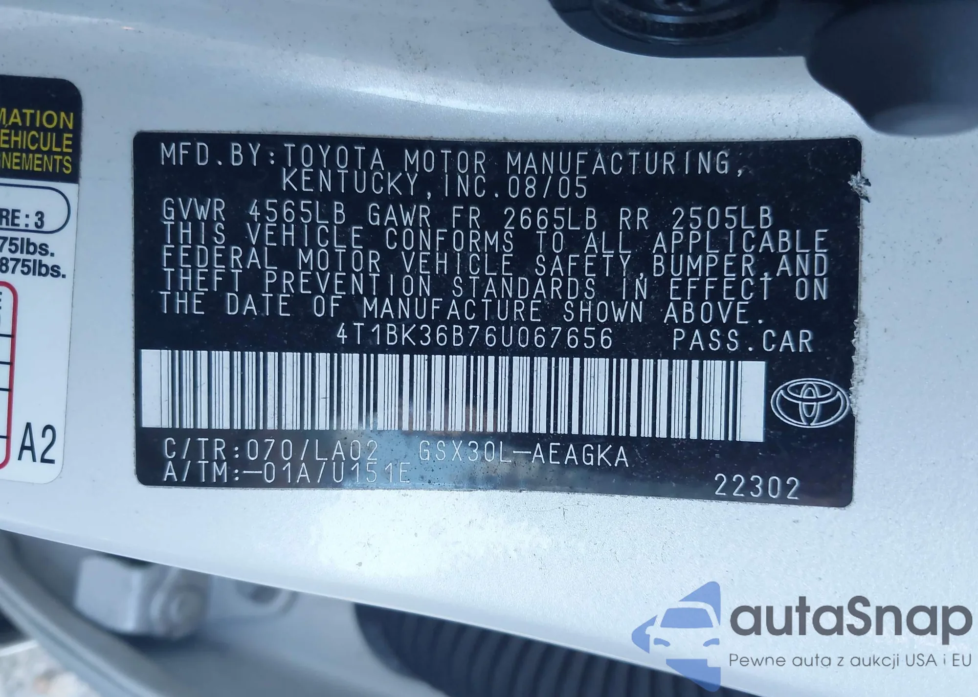 LOT: 43890030 VIN: 4T1BK36B76U067656