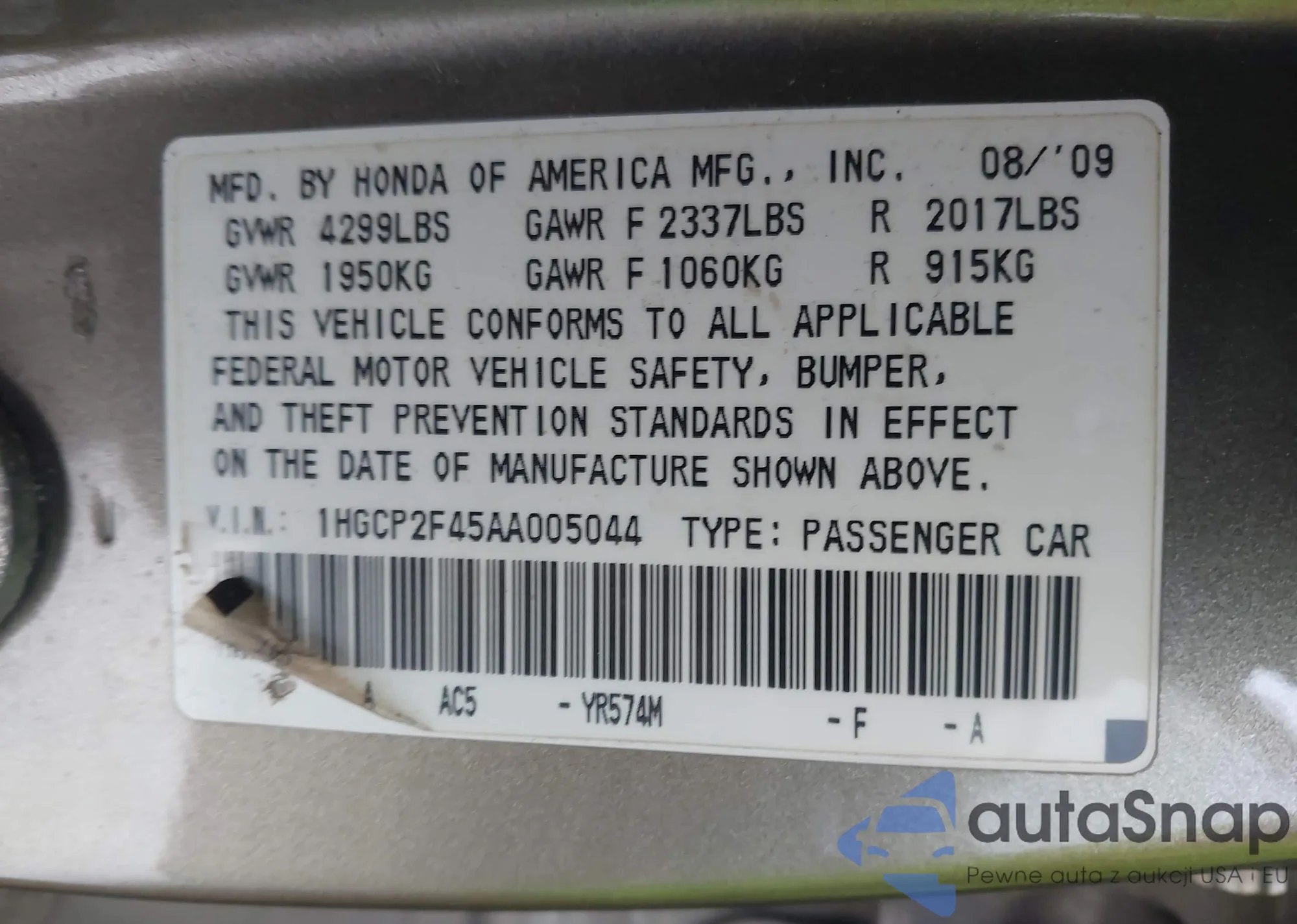 • VIN 1HGCP2F45AA005044