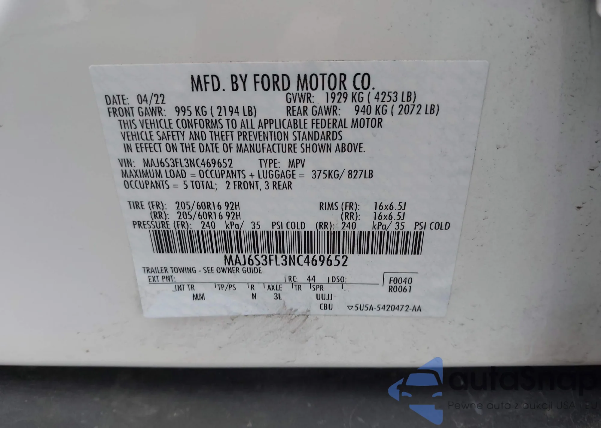 LOT: 43867560 VIN: 1FMYU04172KC76981