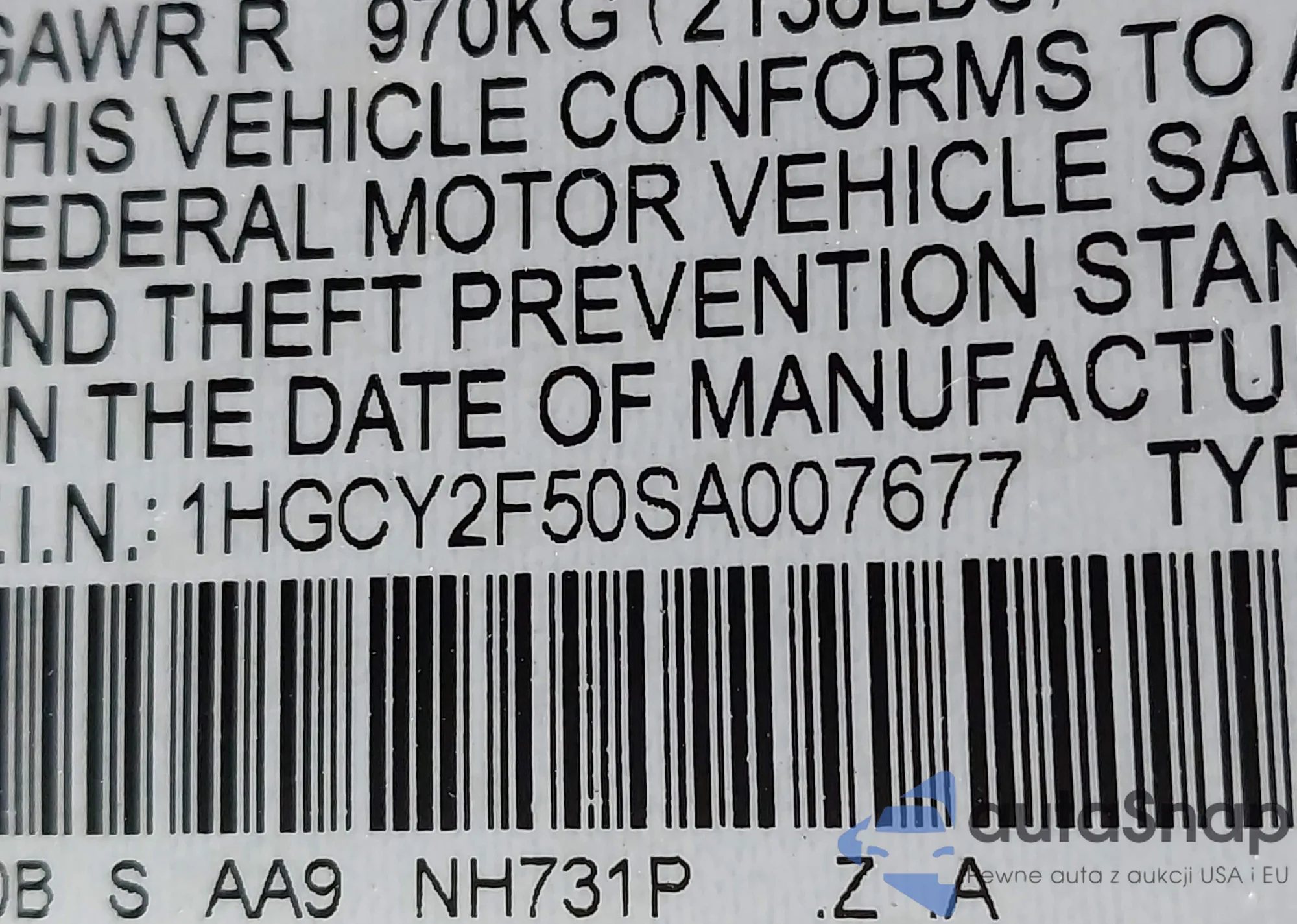 LOT: 43923802 VIN: 1HGCY1F34PA033392