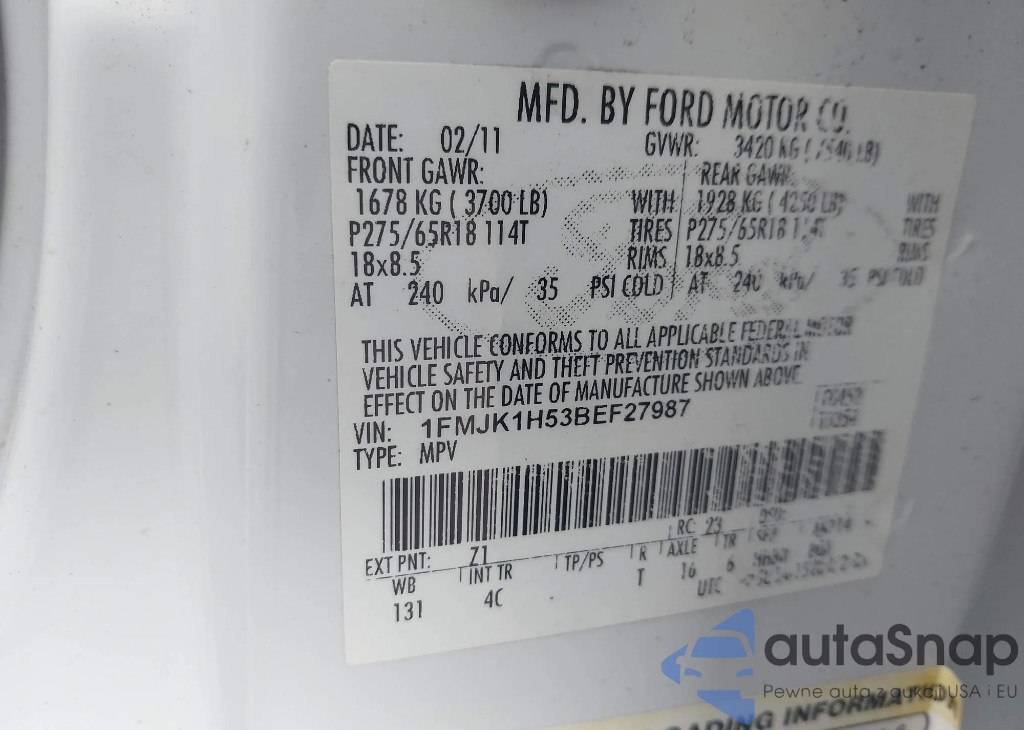 LOT: 43979005 VIN: 1FMJK1H53BEF27987