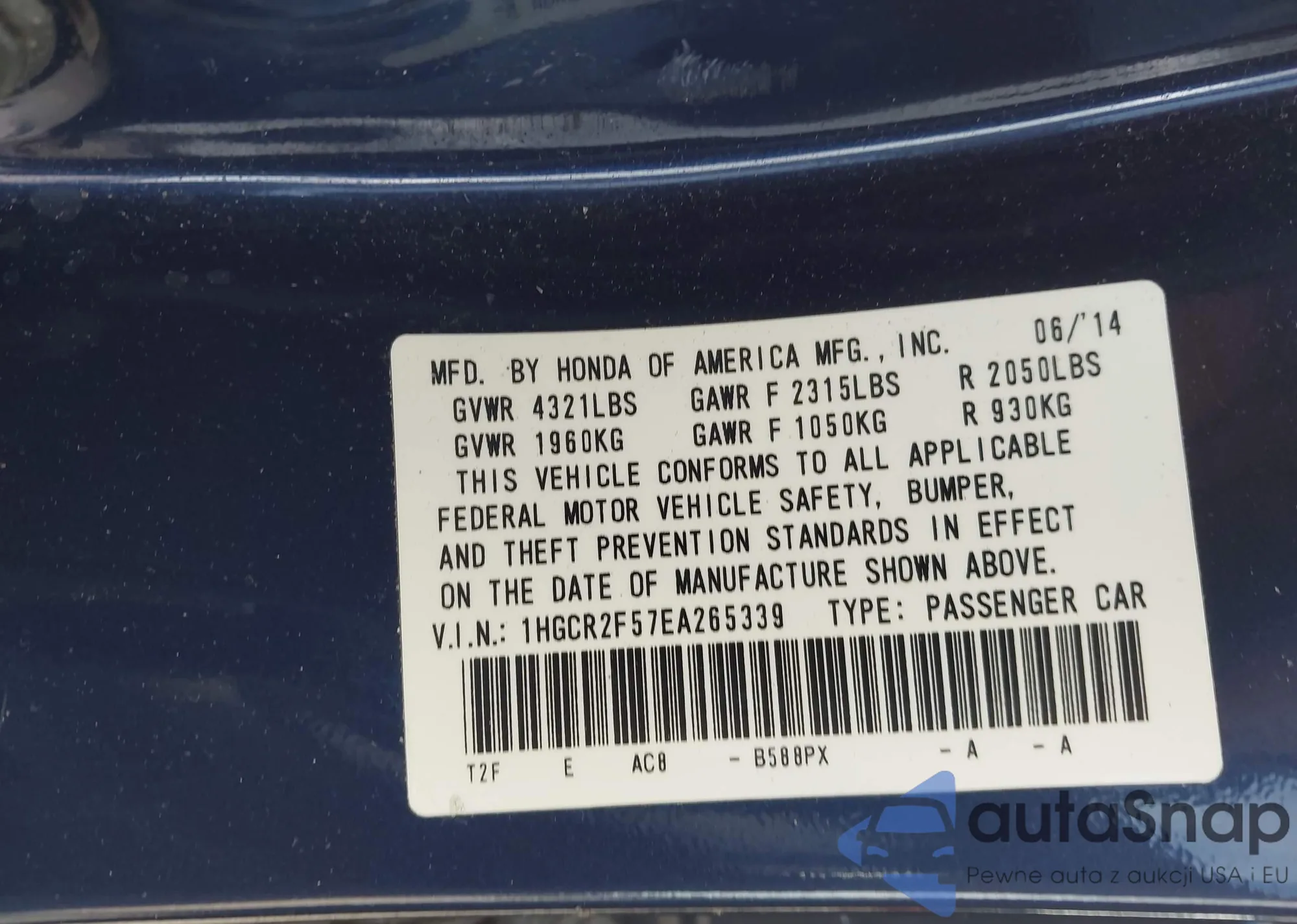 LOT: 43944208 VIN: 1HGCR2F57EA265339