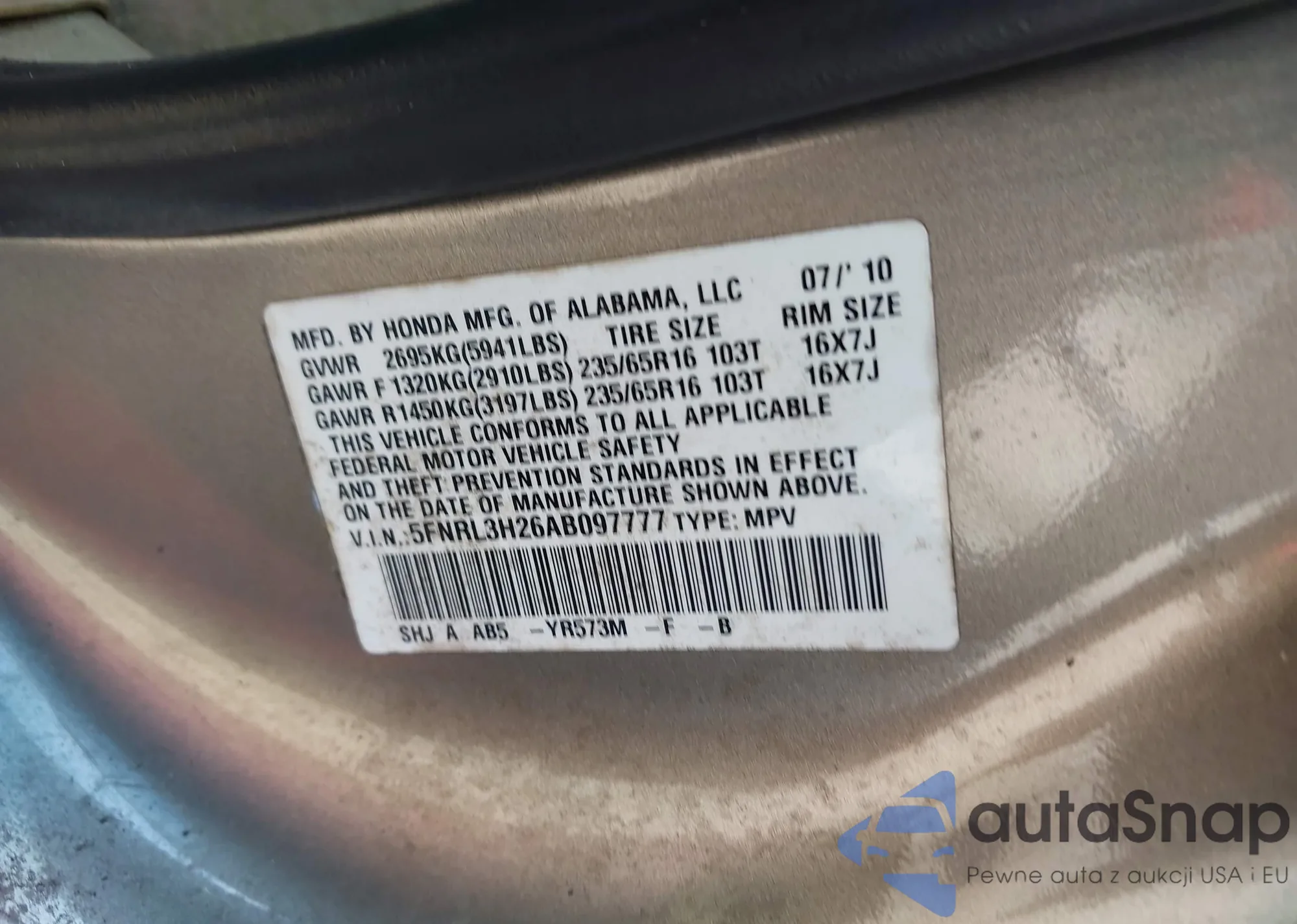 • VIN 5FNRL3H26AB097777