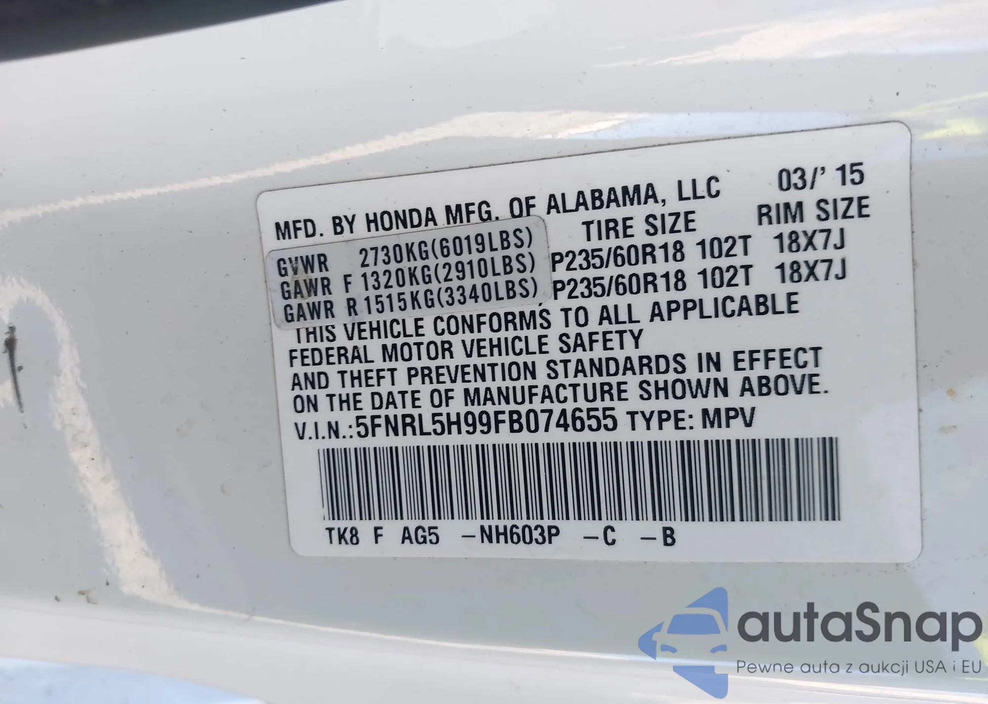 LOT: 43803030 VIN: 5FNRL5H99FB074655