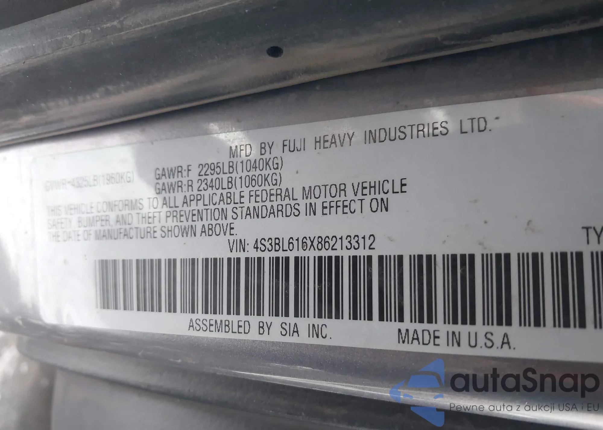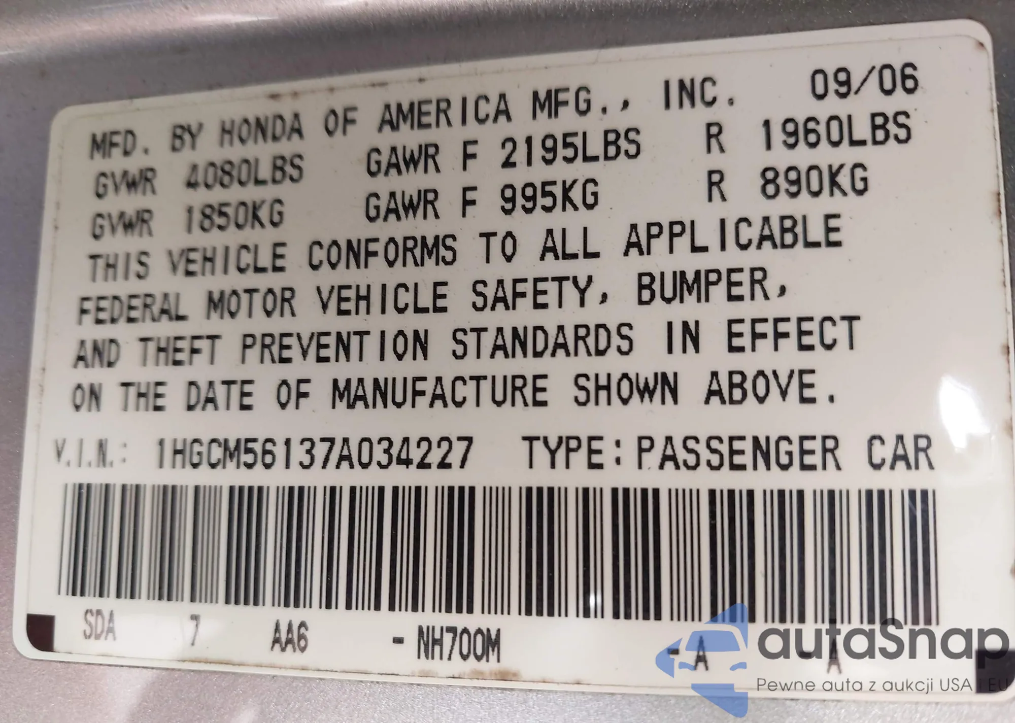 LOT: 43939224 VIN: 1HGCM56137A034227
