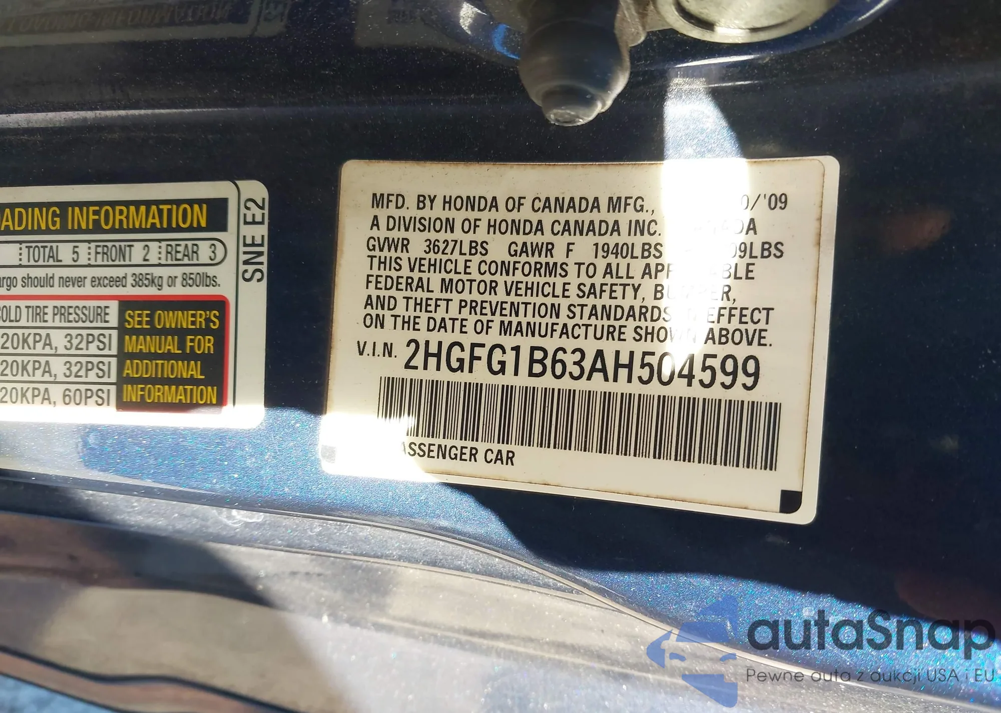 • VIN 2HGFG1B63AH504599