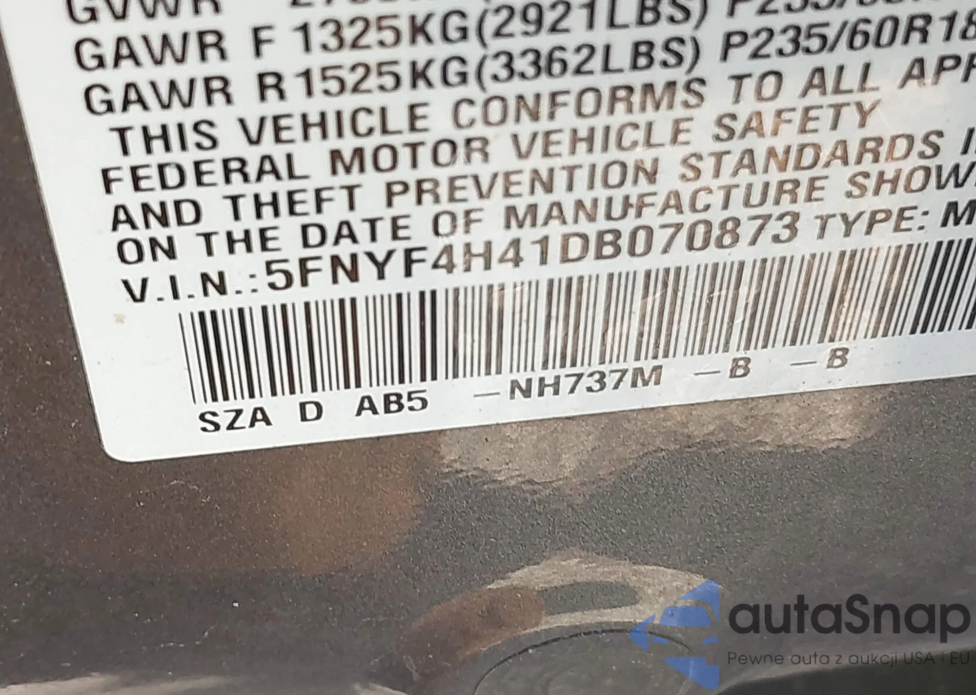 • VIN 5FNYF4H41DB070873