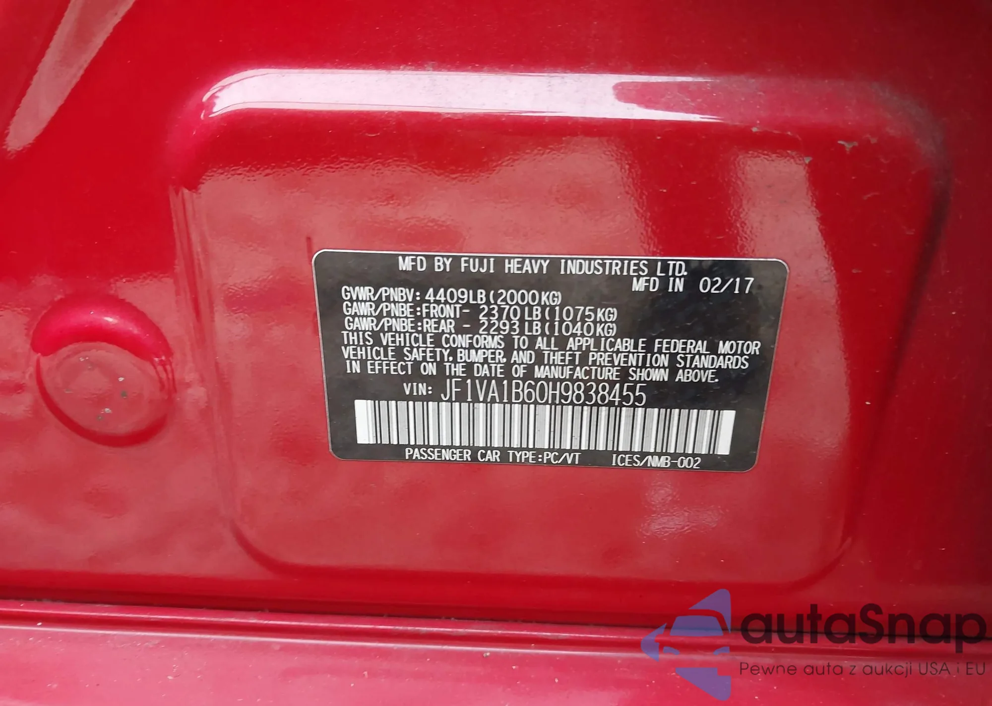 LOT: 43876705 VIN: JF1VA1B60H9838455