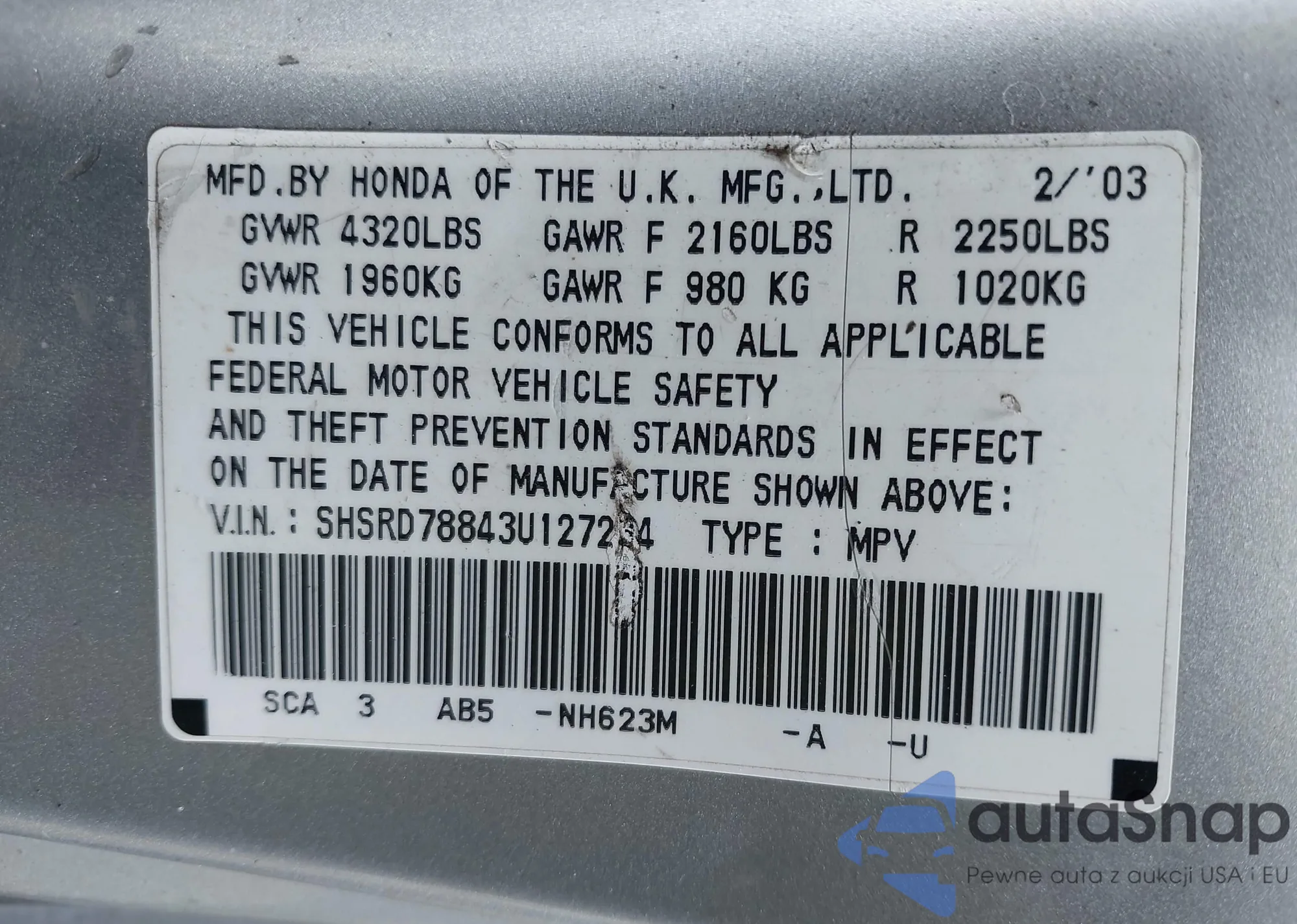 LOT: 43887336 VIN: SHSRD78843U127234