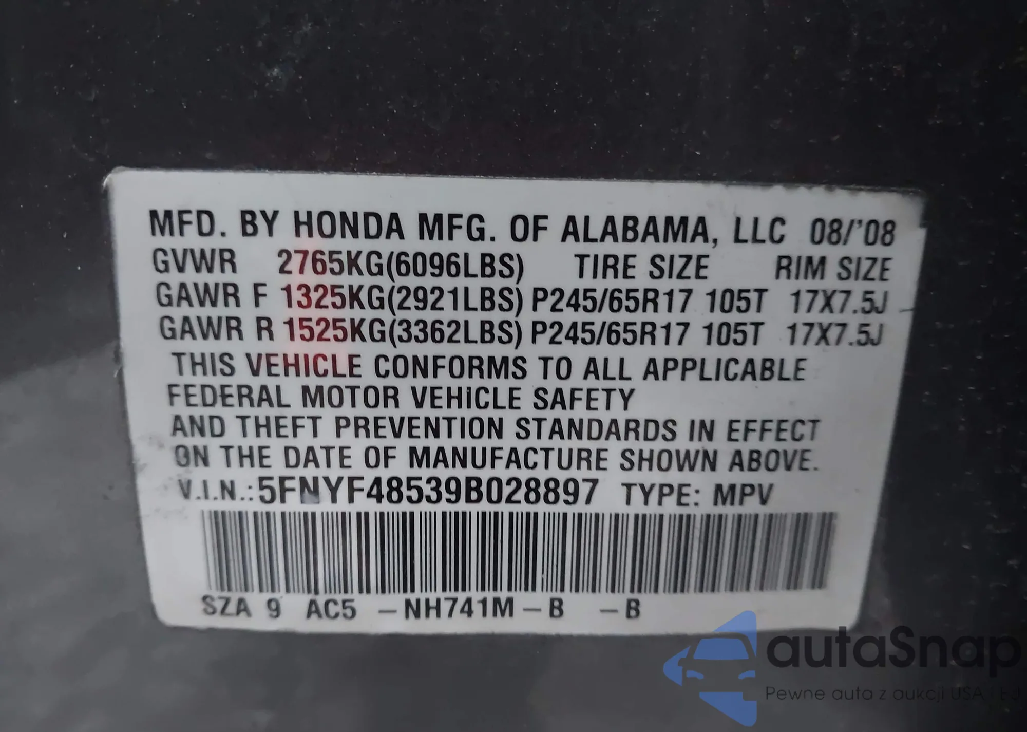 LOT: 44032261 VIN: 5FNYF48539B028897