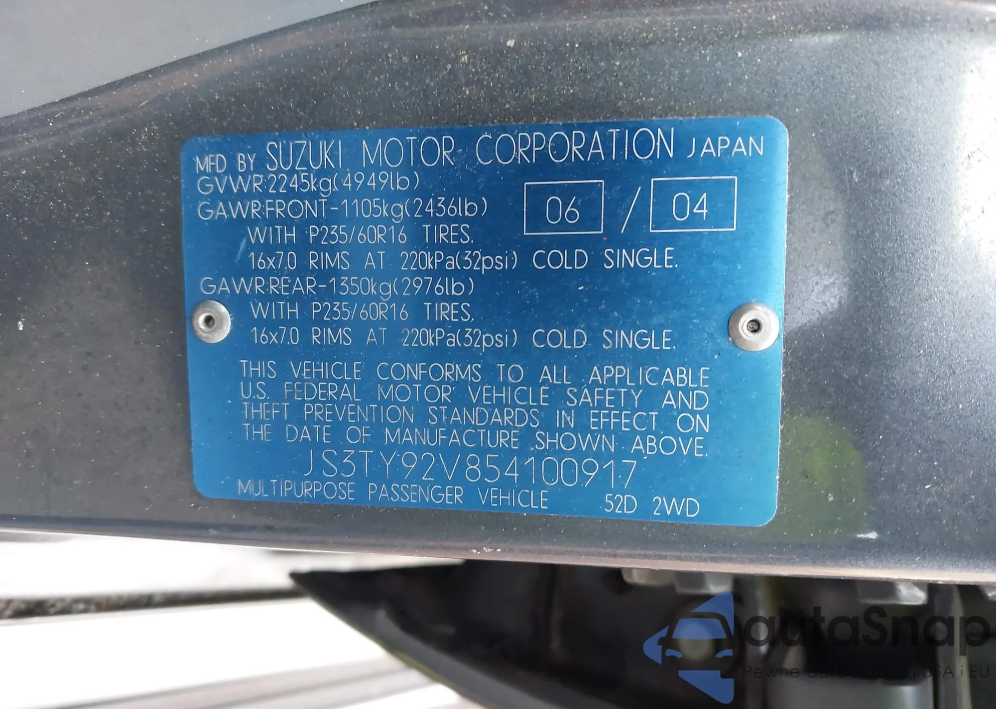 • VIN JS3TY92V854100917