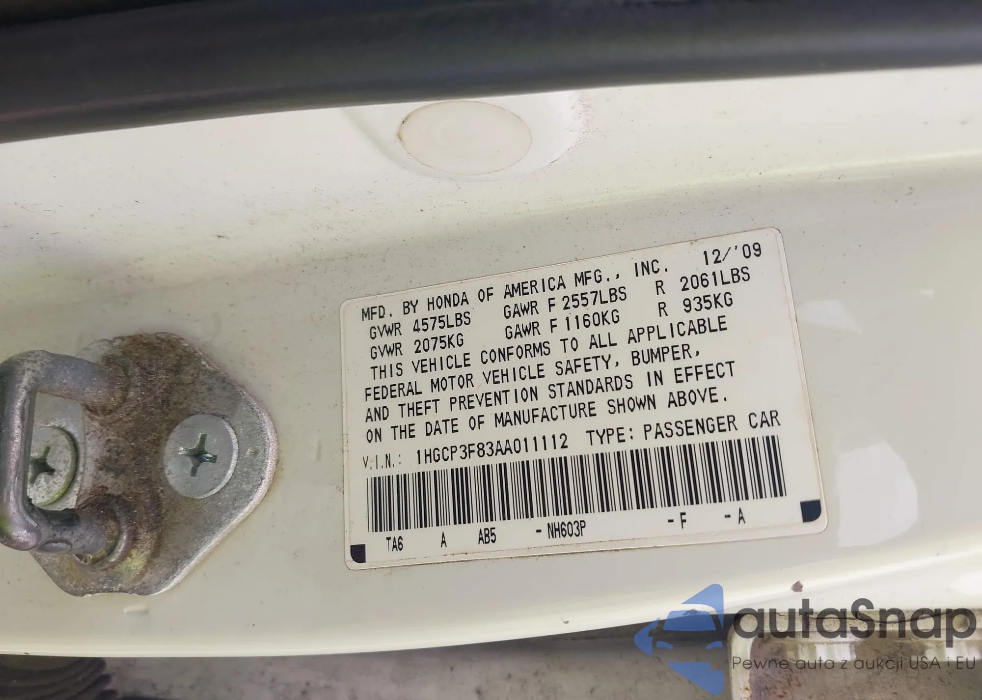 LOT: 43901321 VIN: 1HGCP3F83AA011112