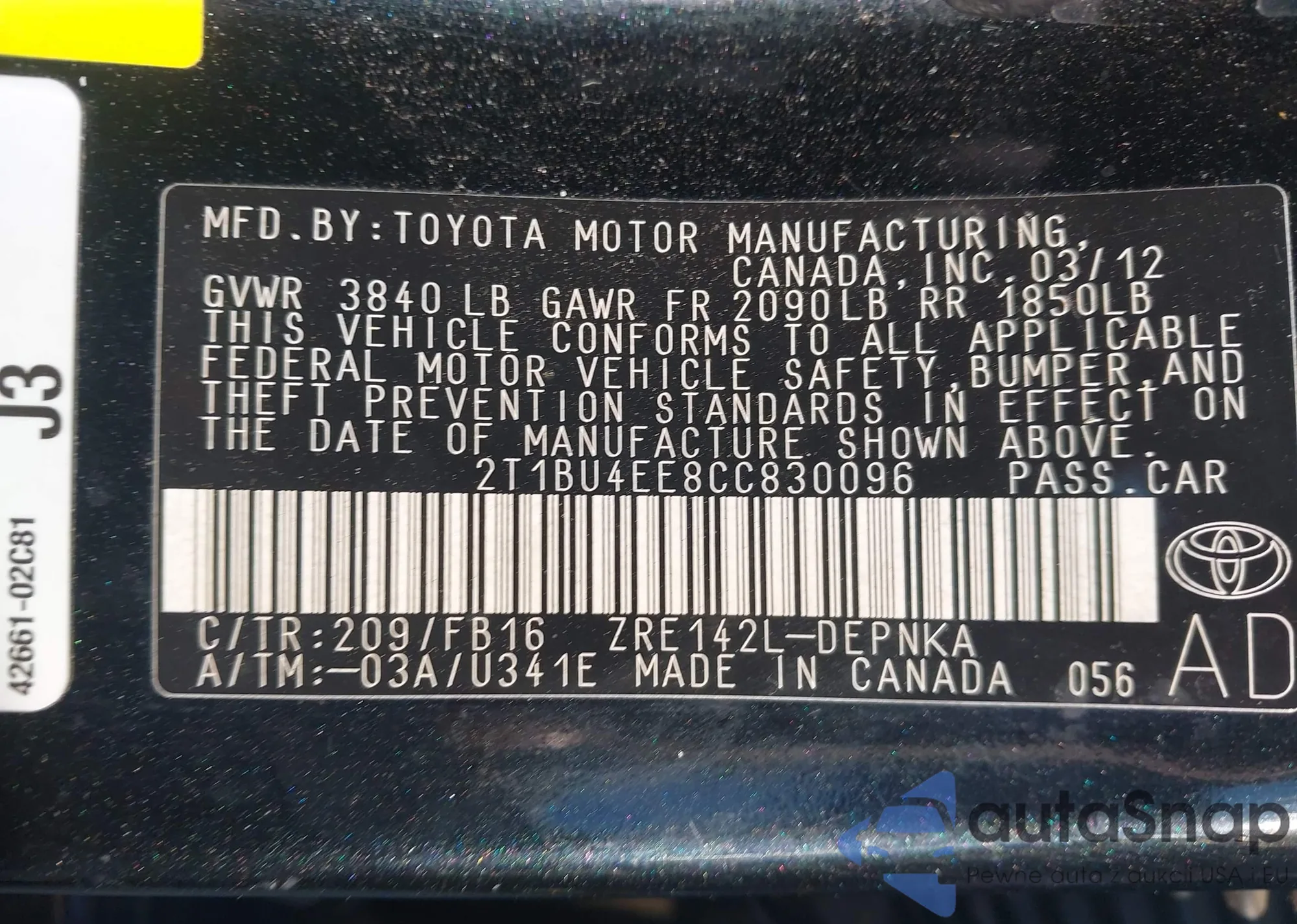 • VIN 2T1BU4EE8CC830096