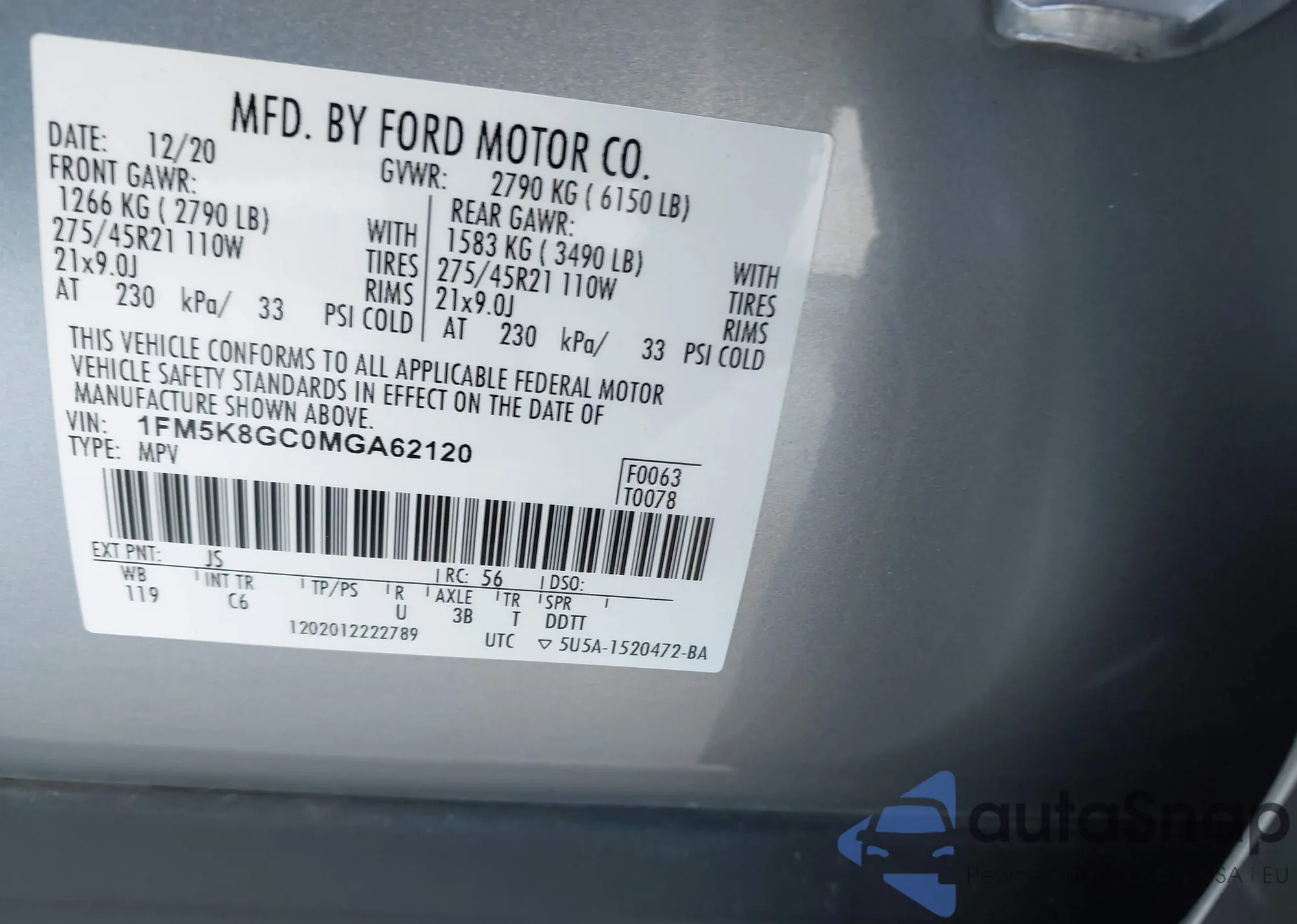 • VIN 1FM5K8GC0MGA62120