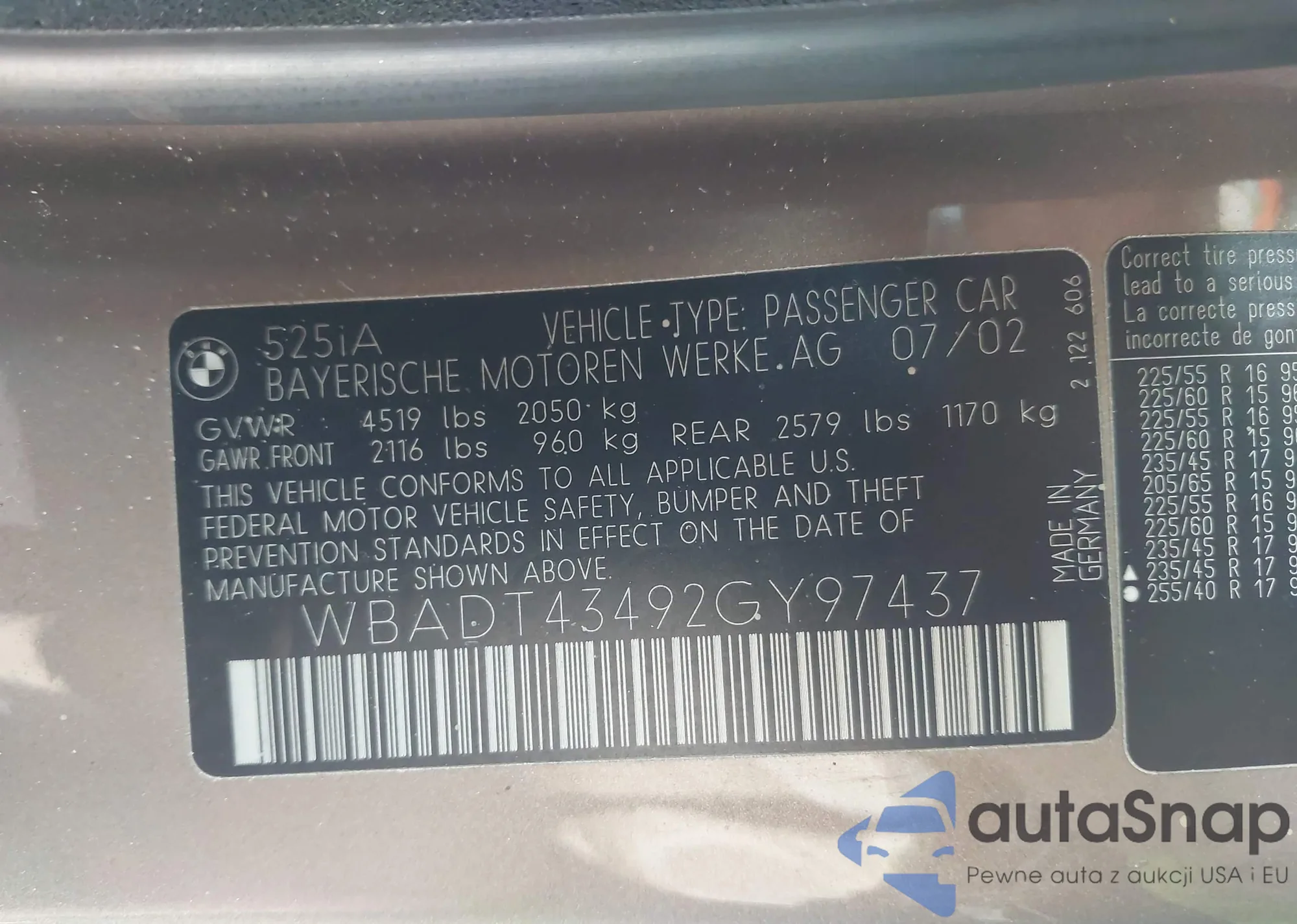 2002 BMW 525Ia из США, поврежденный, VIN WBADT43492GY97437