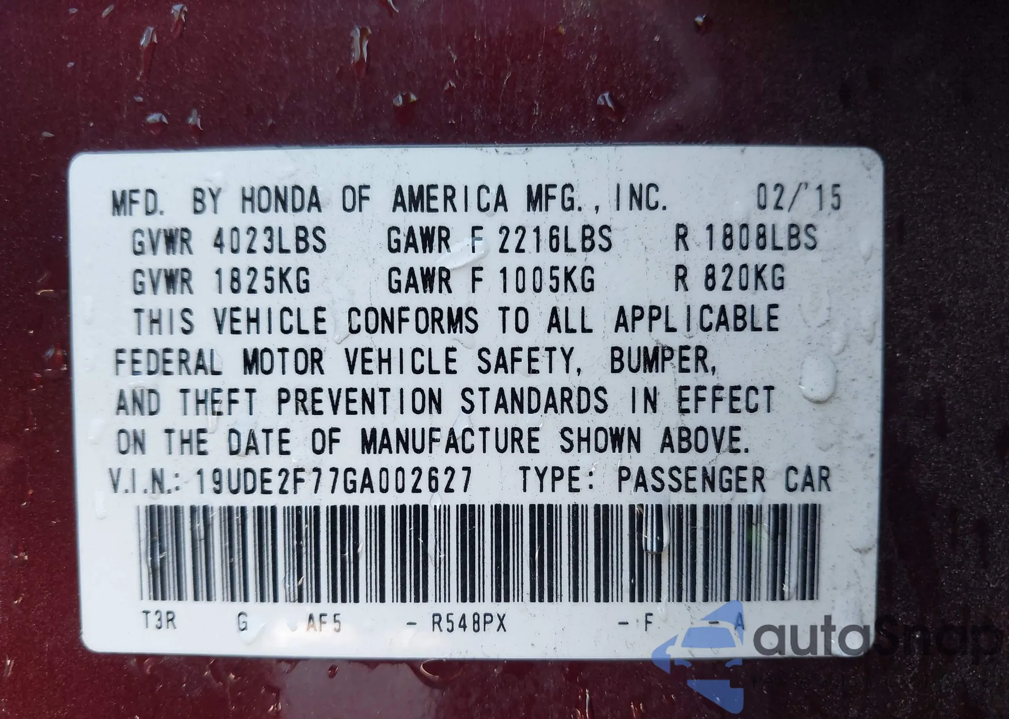 • VIN 19UDE2F77GA002627