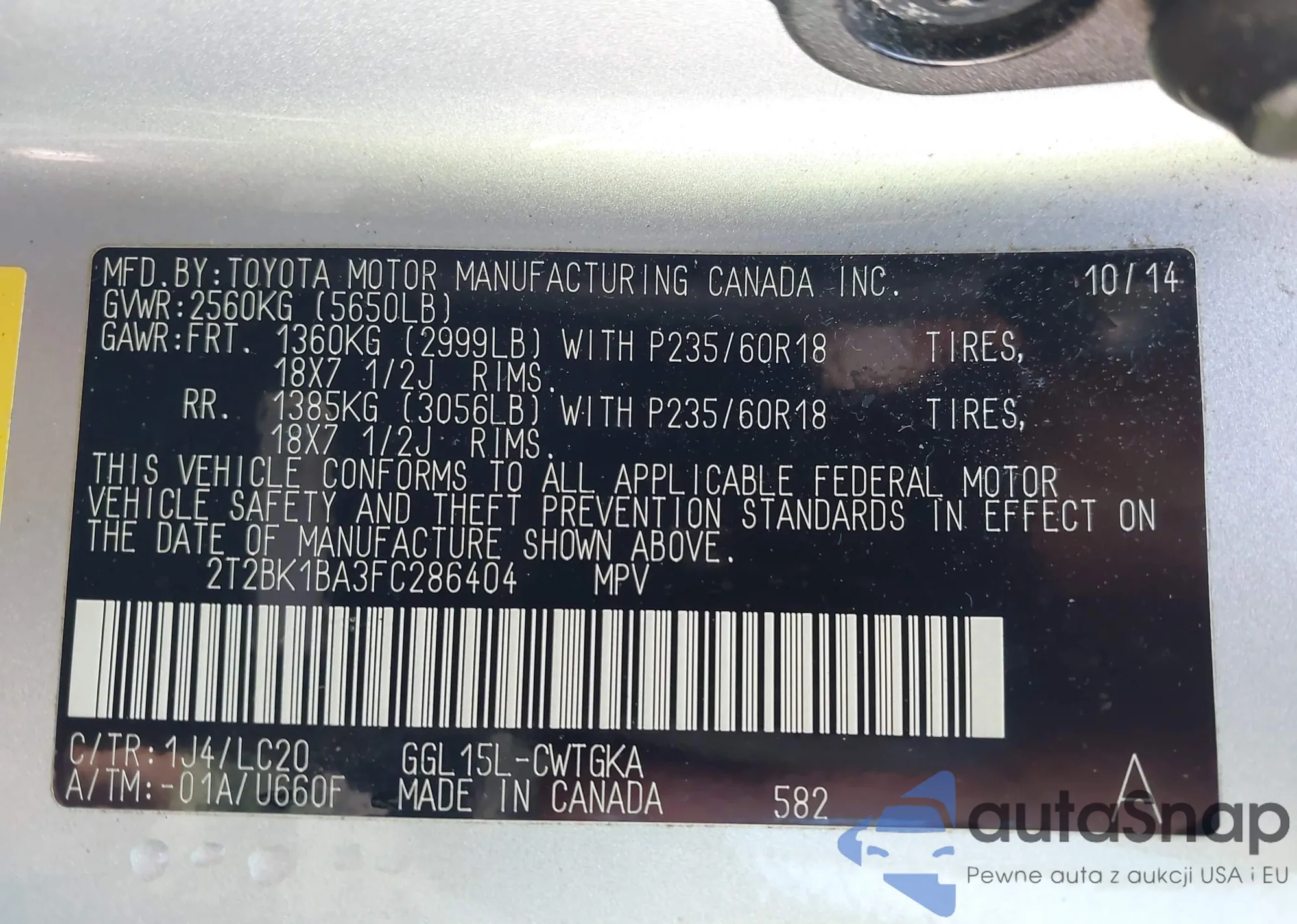• VIN 2T2BK1BA3FC286404