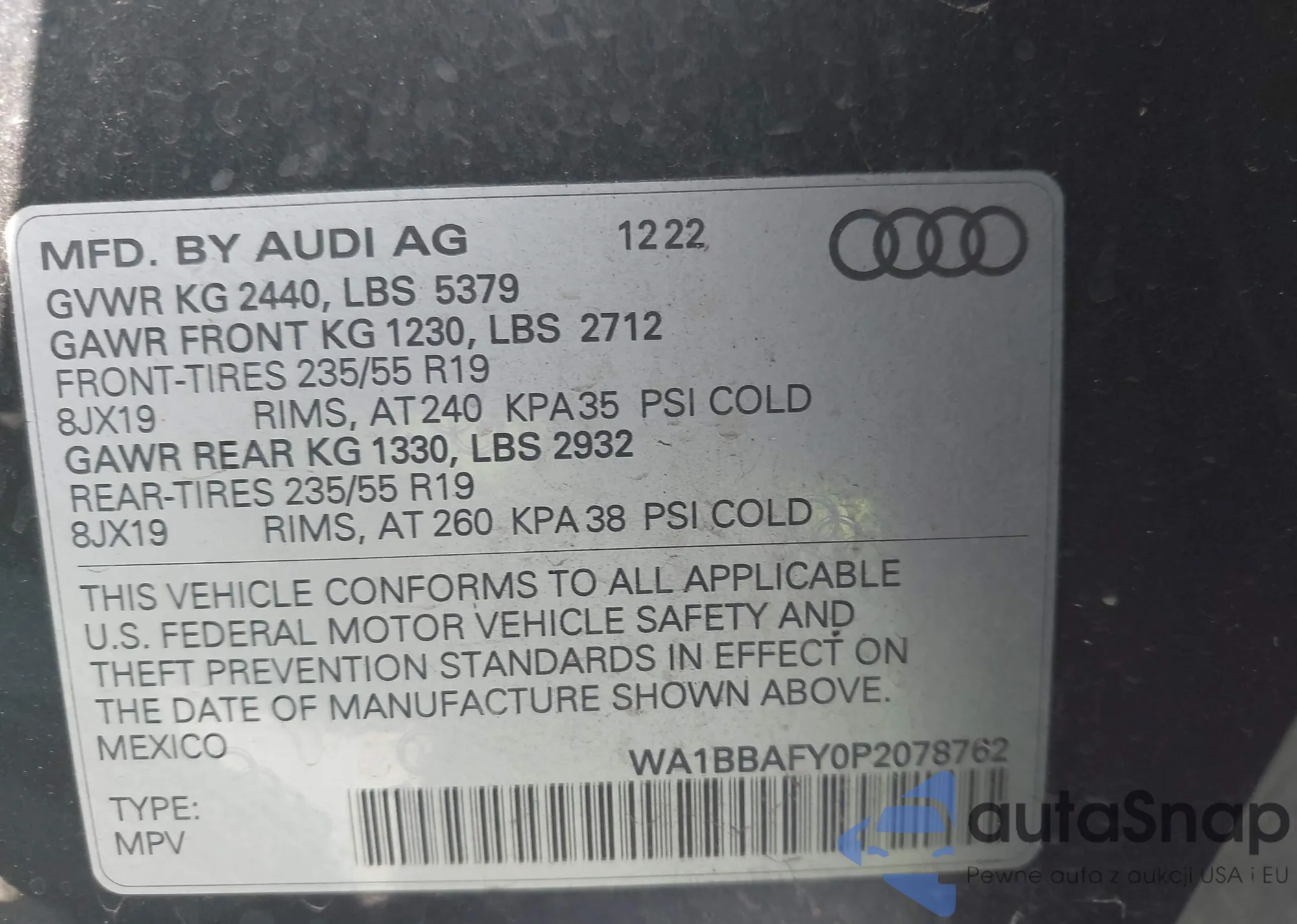 LOT: 43335663 VIN: WA1BBAFY0P2078762