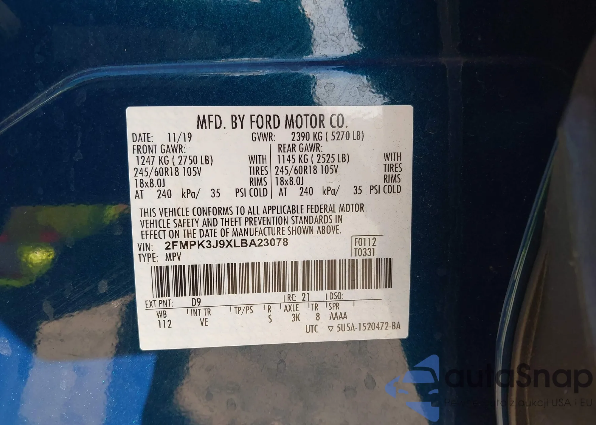 • VIN 1FMCU9DZ2MUA92754