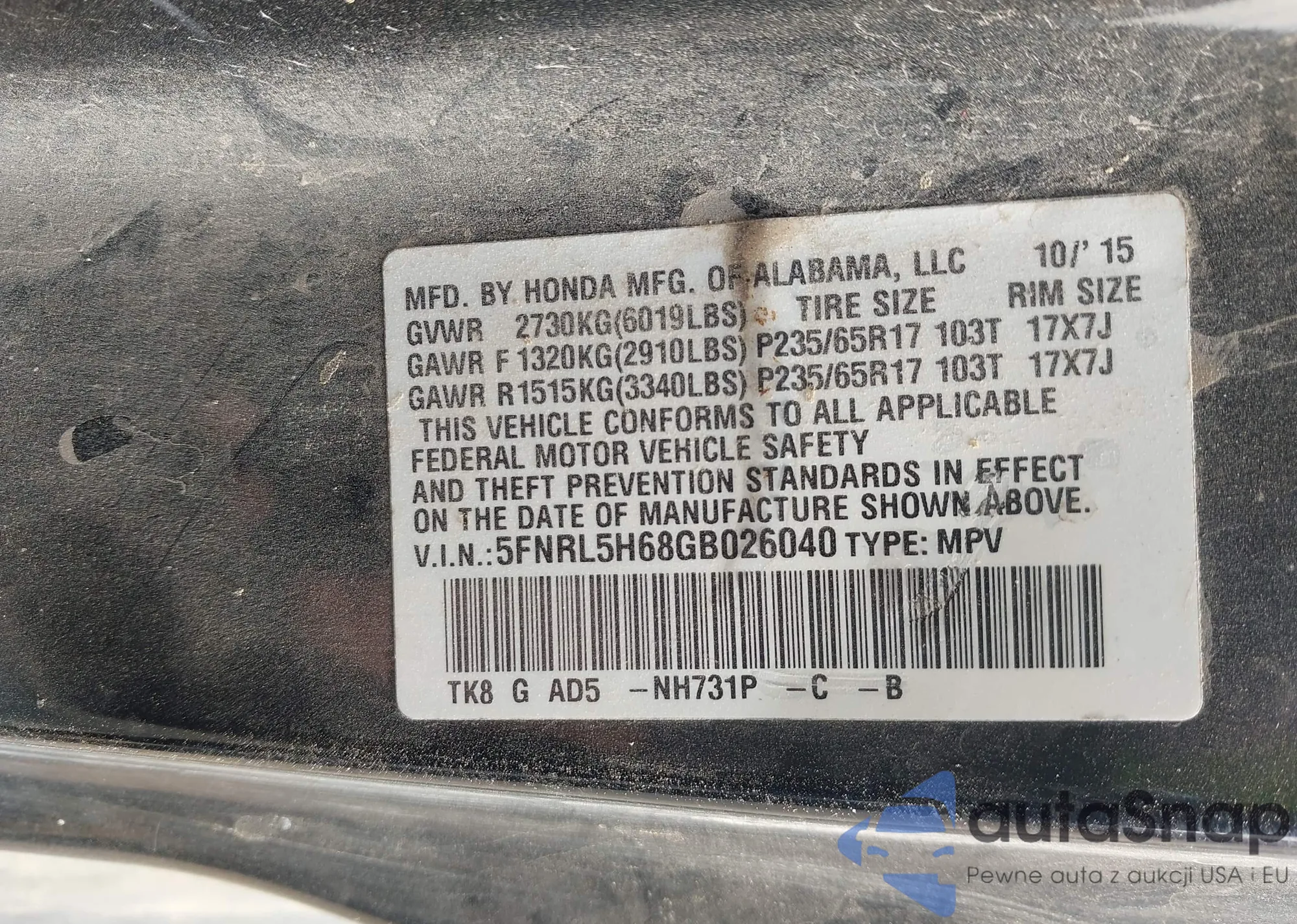 • VIN 5FNRL5H68GB026040