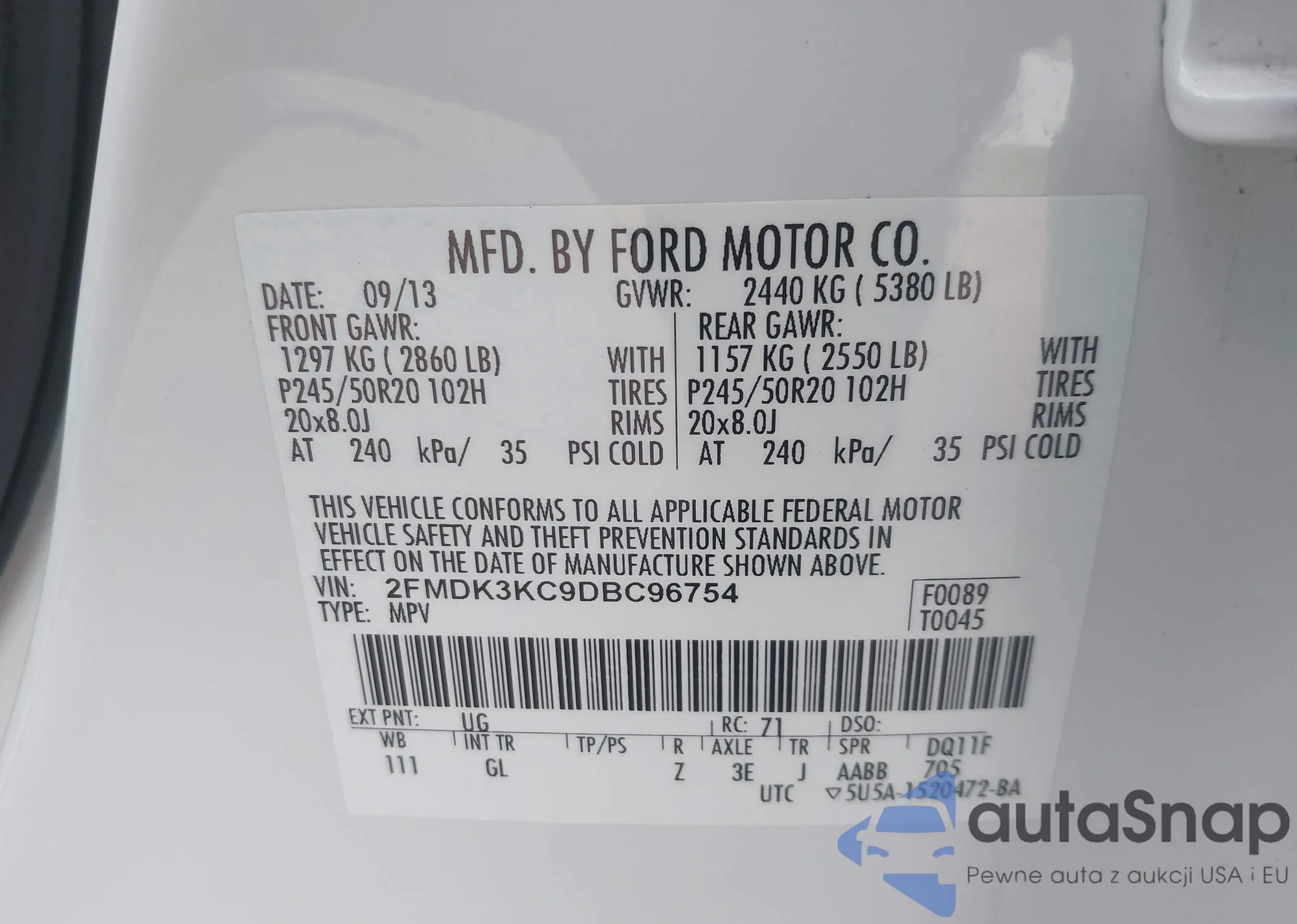 • VIN 2FMDK3KC9DBC96754