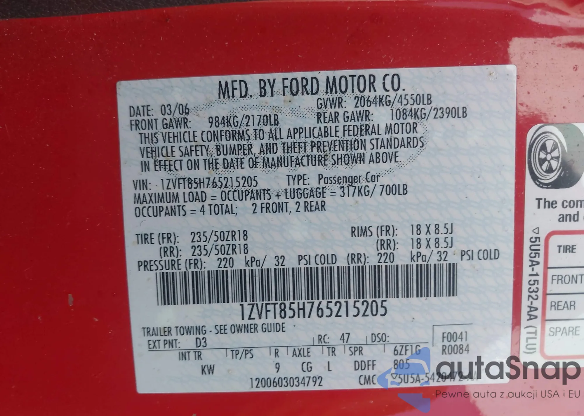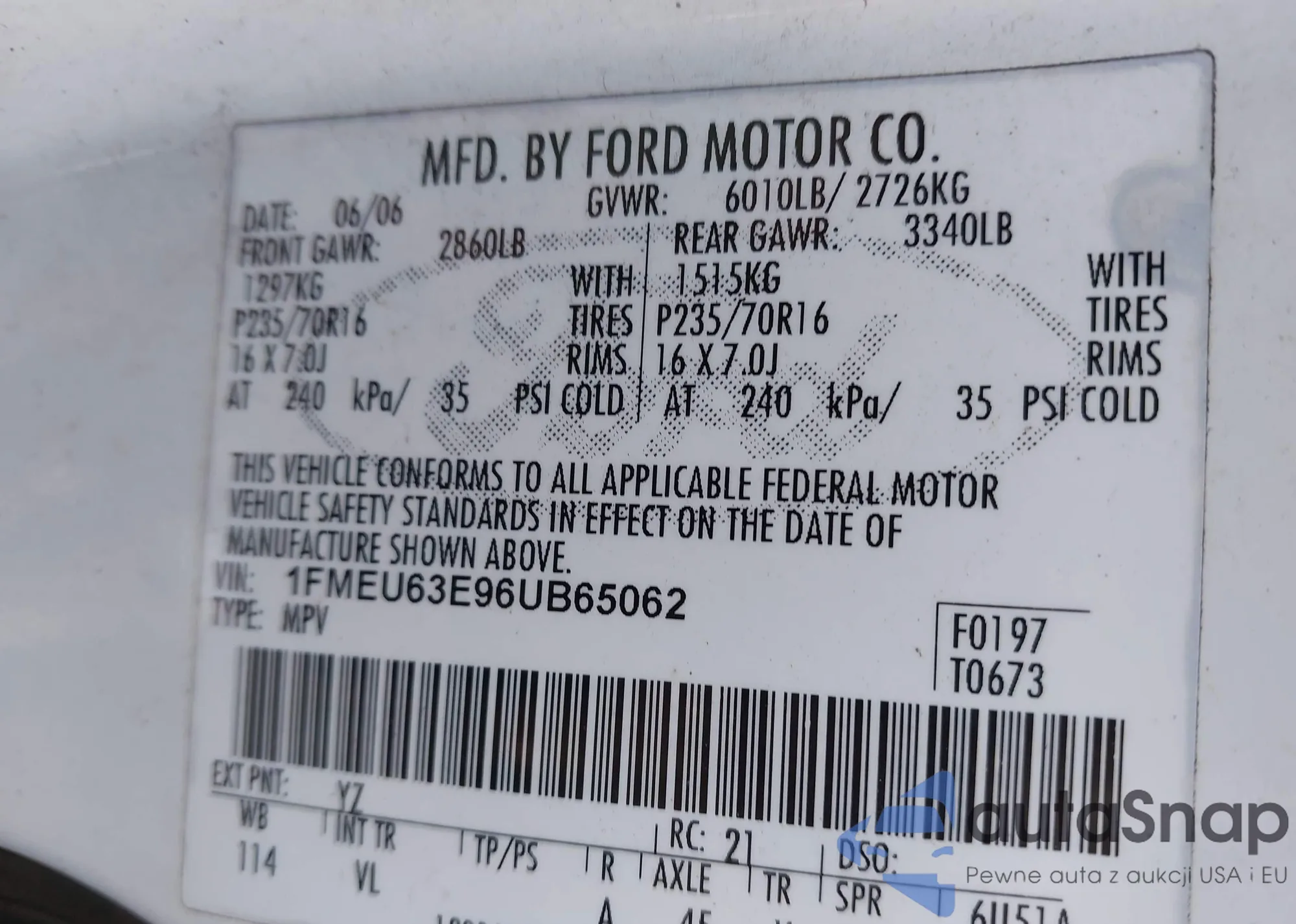 LOT: 43938425 VIN: 1FMEU63E96UB65062