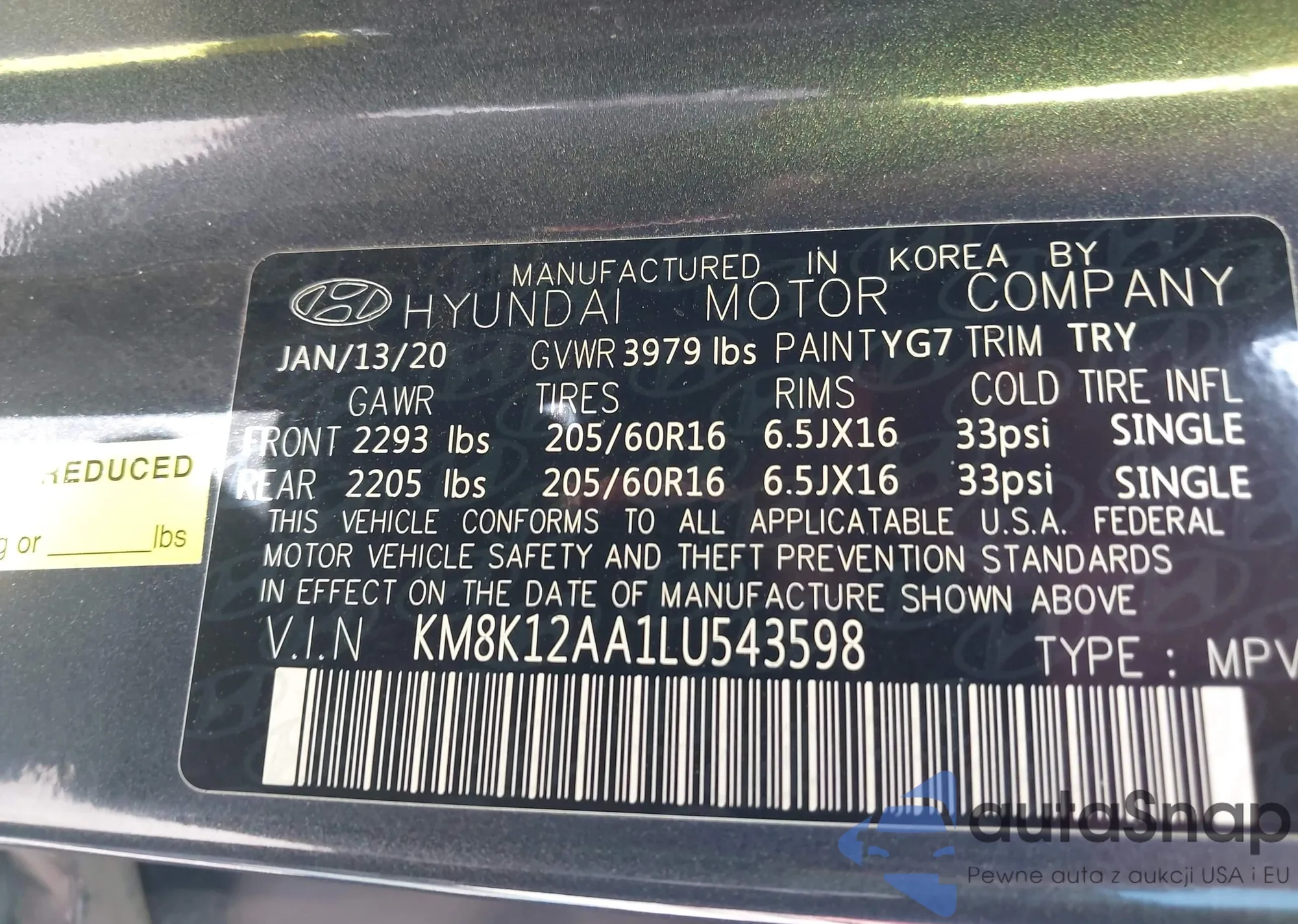 • VIN KM8K12AA1LU543598