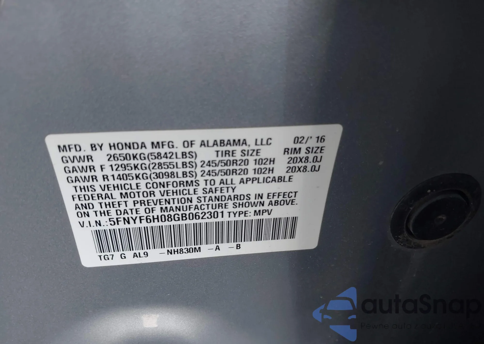 • VIN 5FNYF6H08GB062301