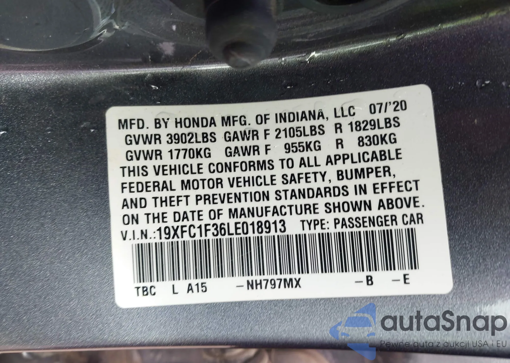 LOT: 43477101 VIN: 2HGFB2F83FH542163