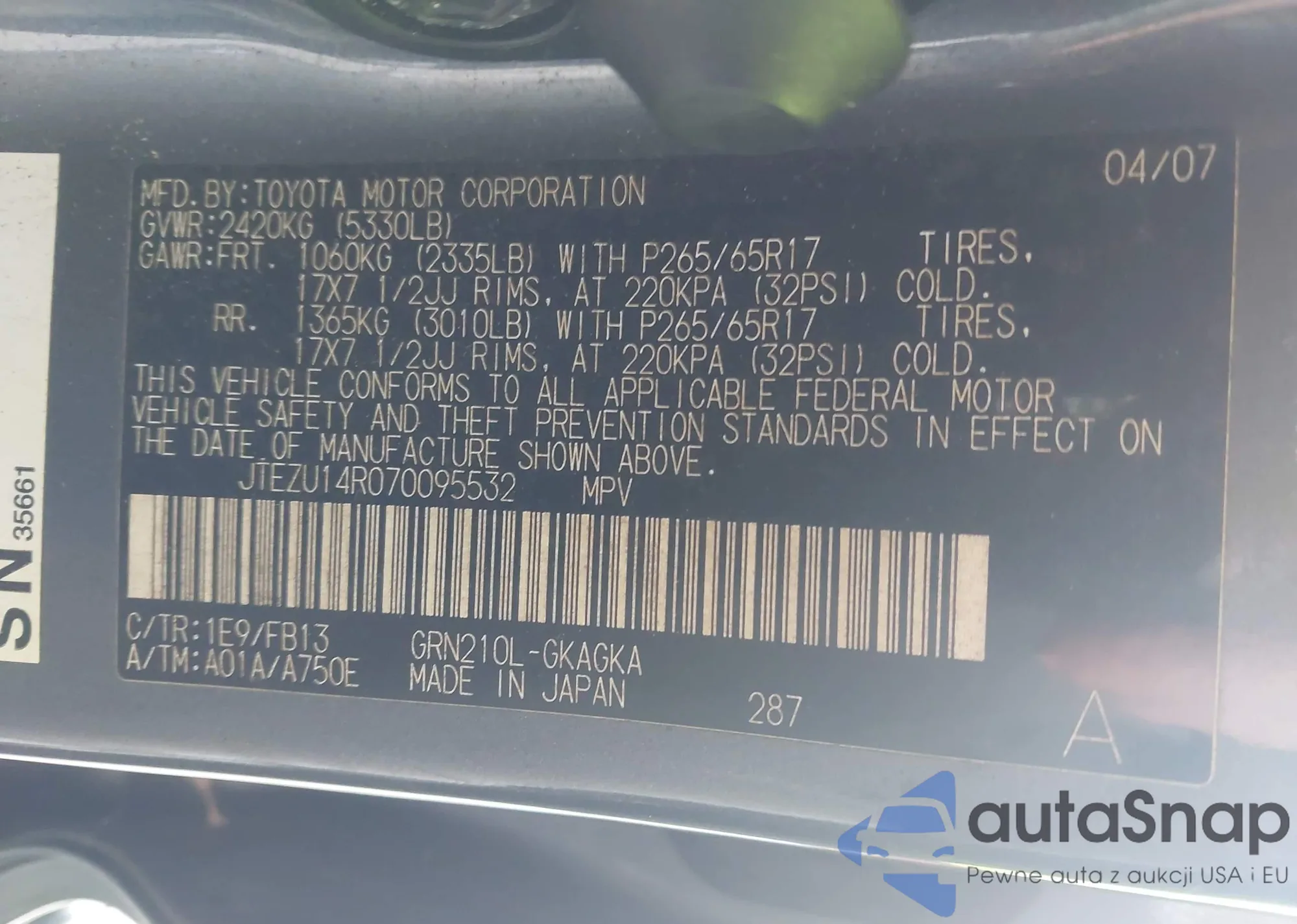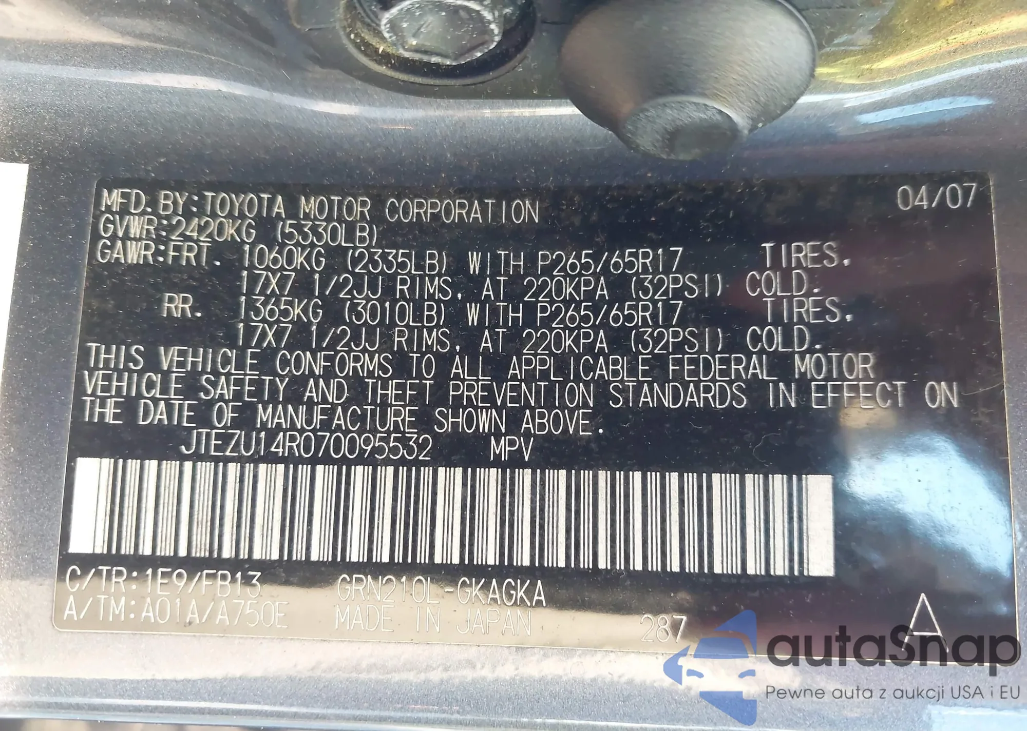 LOT: 43612100 VIN: JTEZU14R070095532