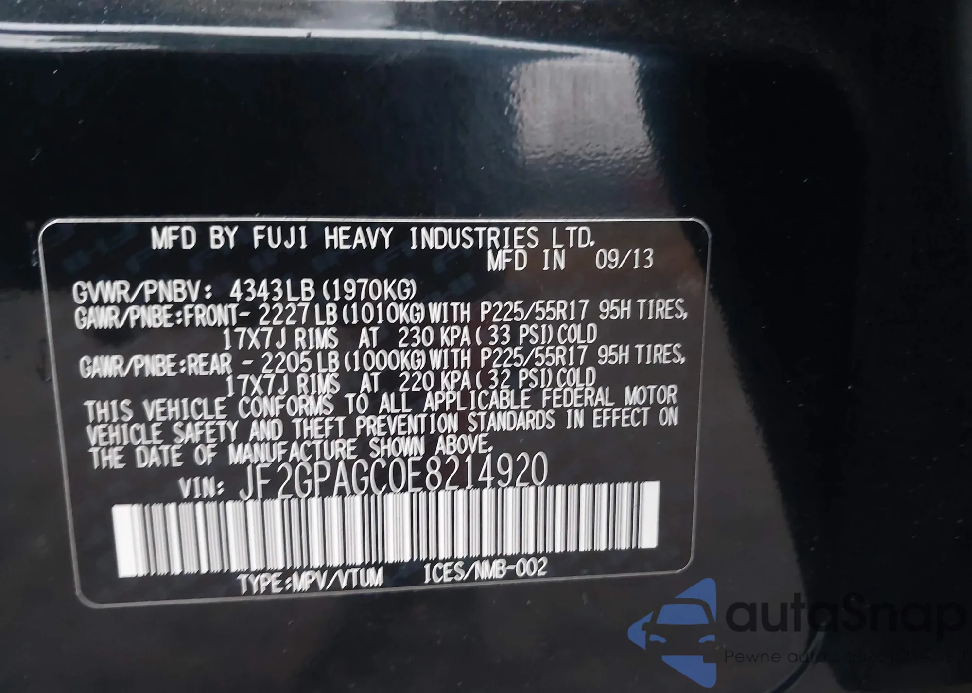 LOT: 43549267 VIN: JF2GPAGC0E8214920