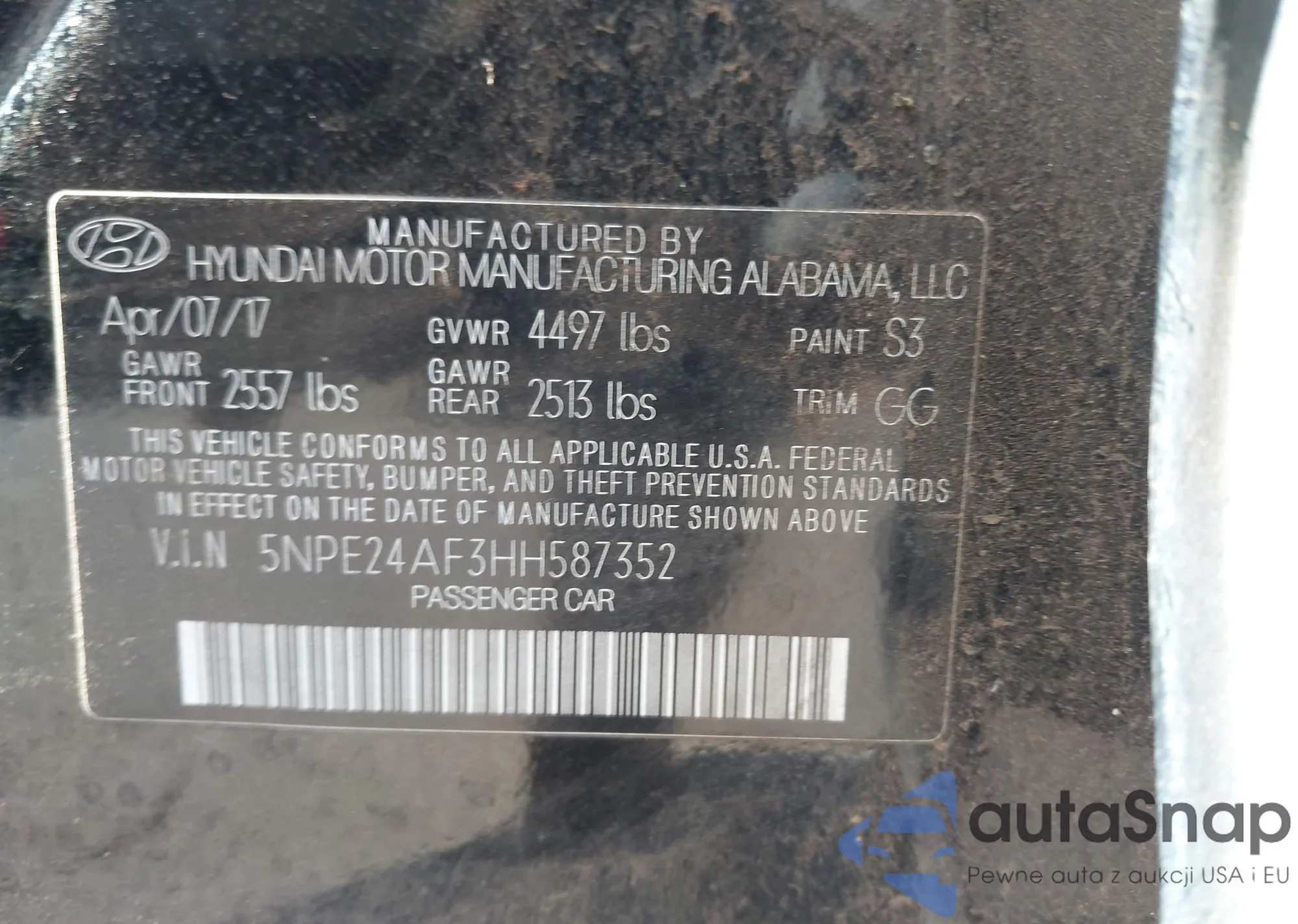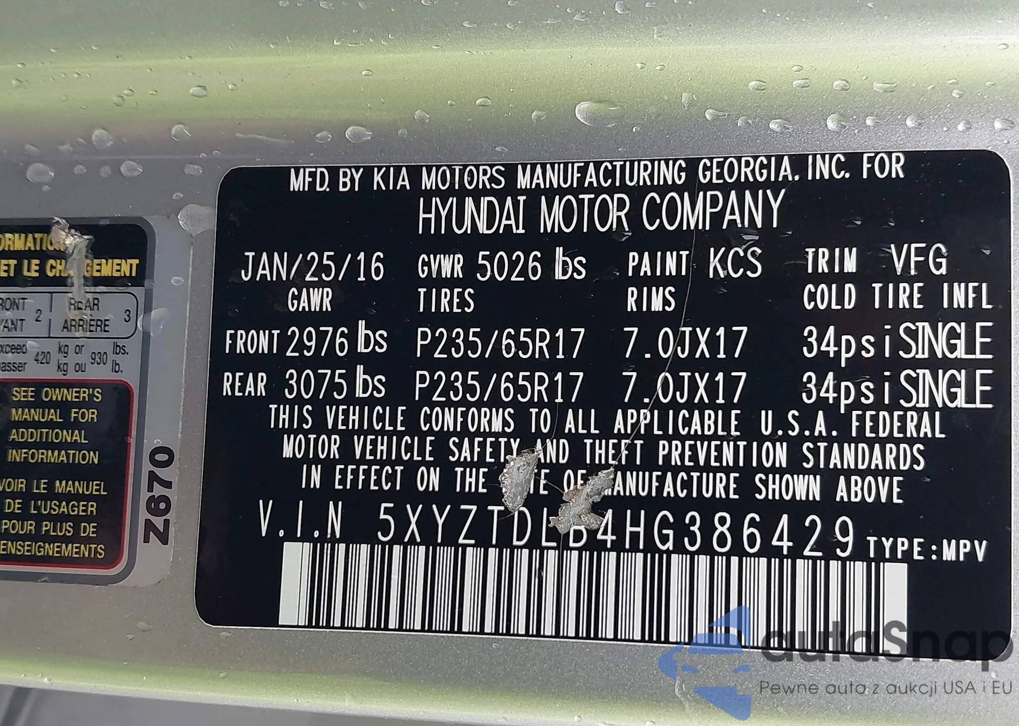 • VIN 5XYZTDLB4HG386429