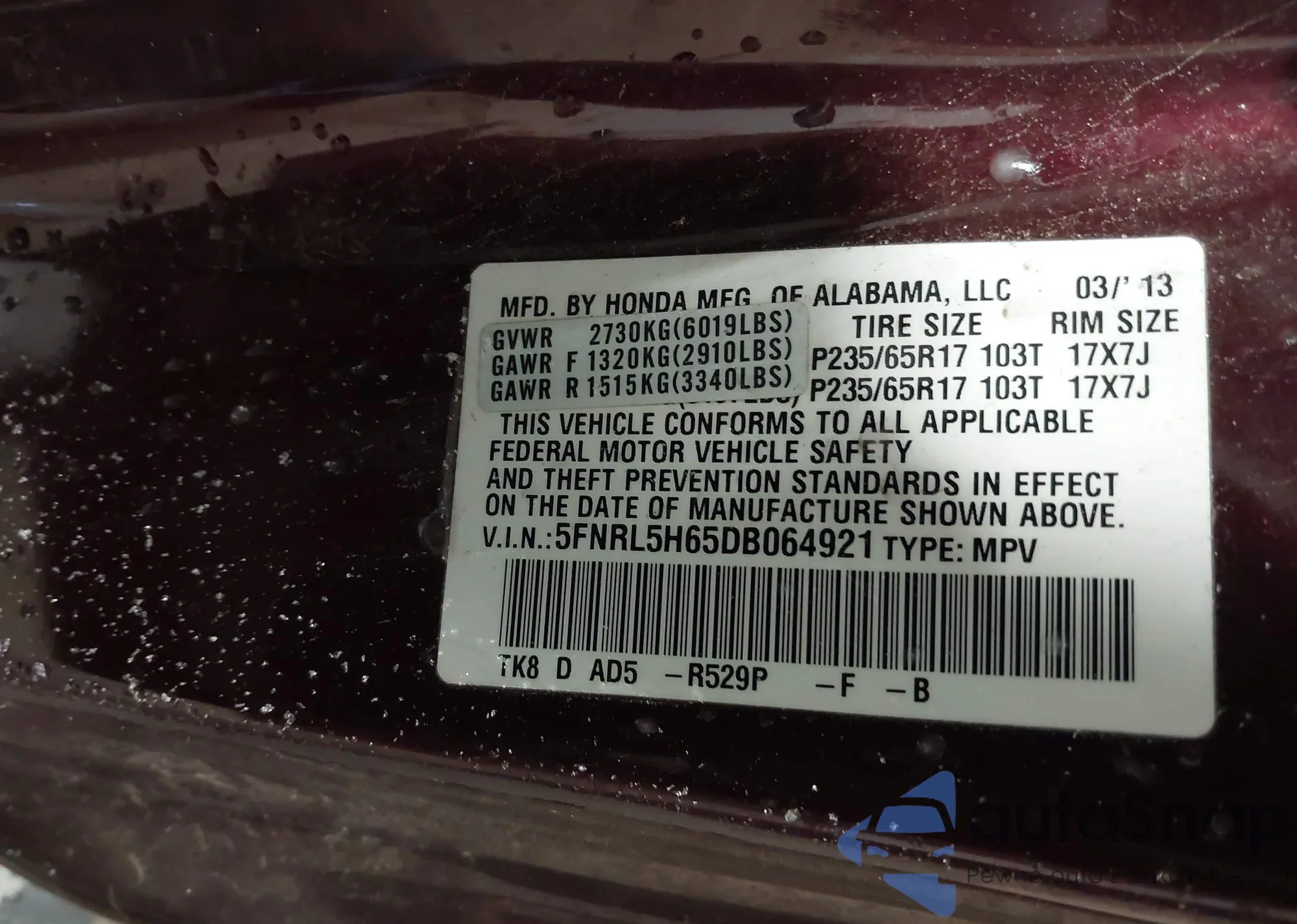 • VIN 5FNRL5H65DB064921
