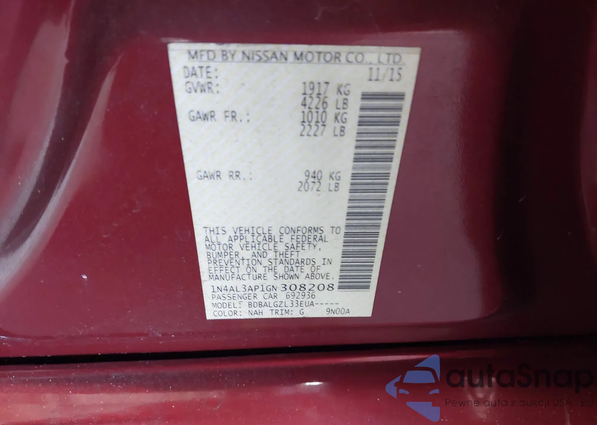 LOT: 43714277 VIN: 1N4AL3AP1GN308208