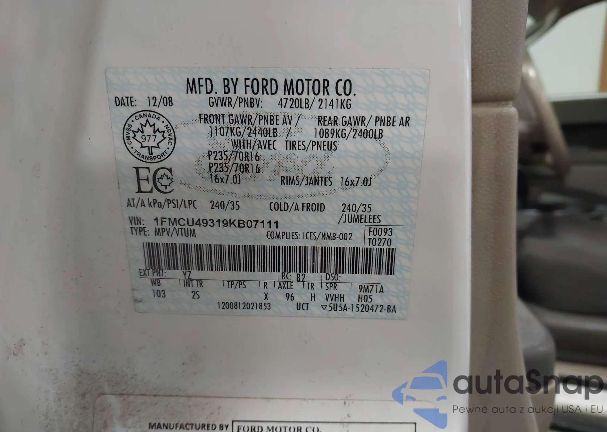 LOT: 43731328 VIN: 1FMCU49319KB07111