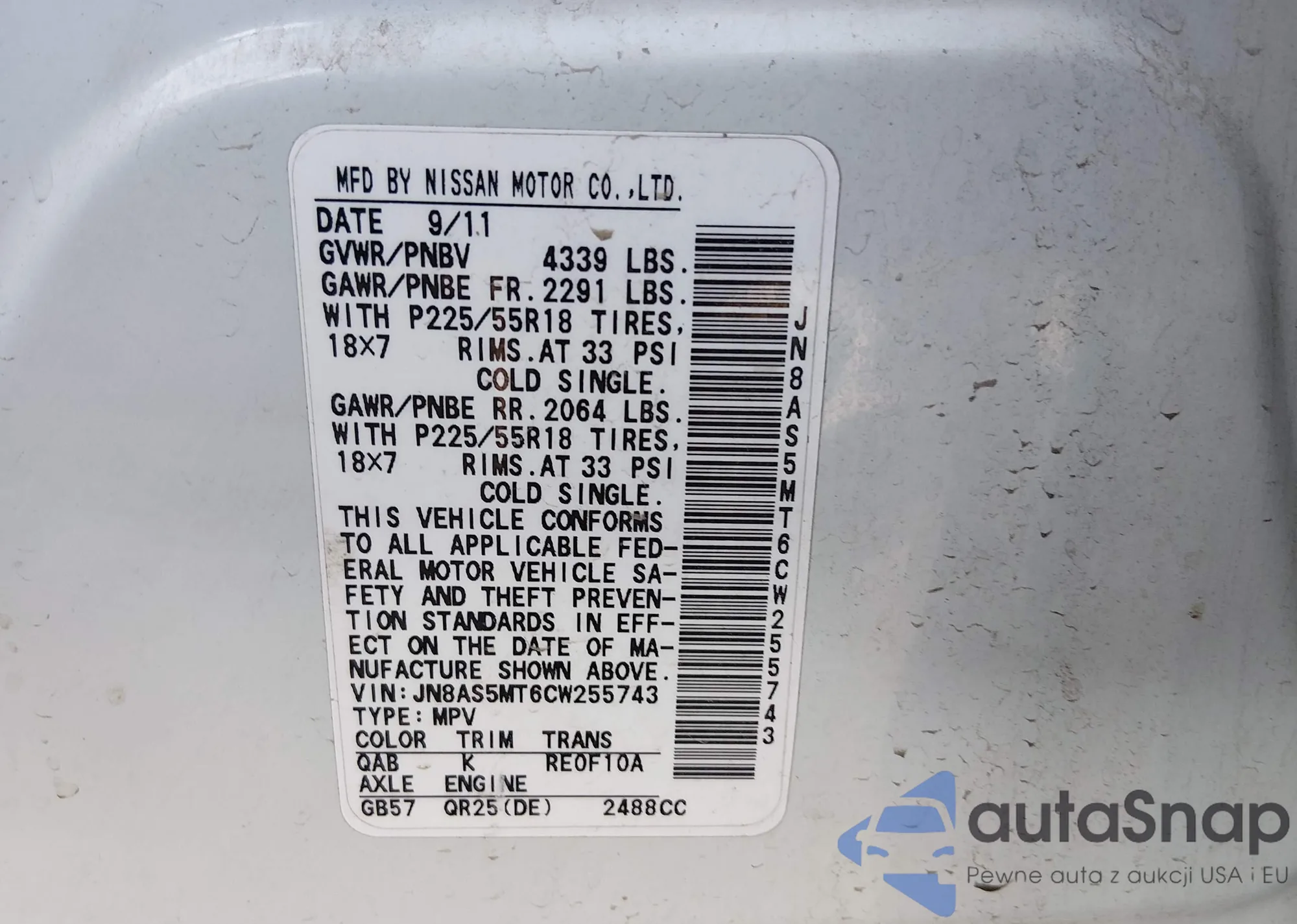 • VIN JN8AS5MT6CW255743