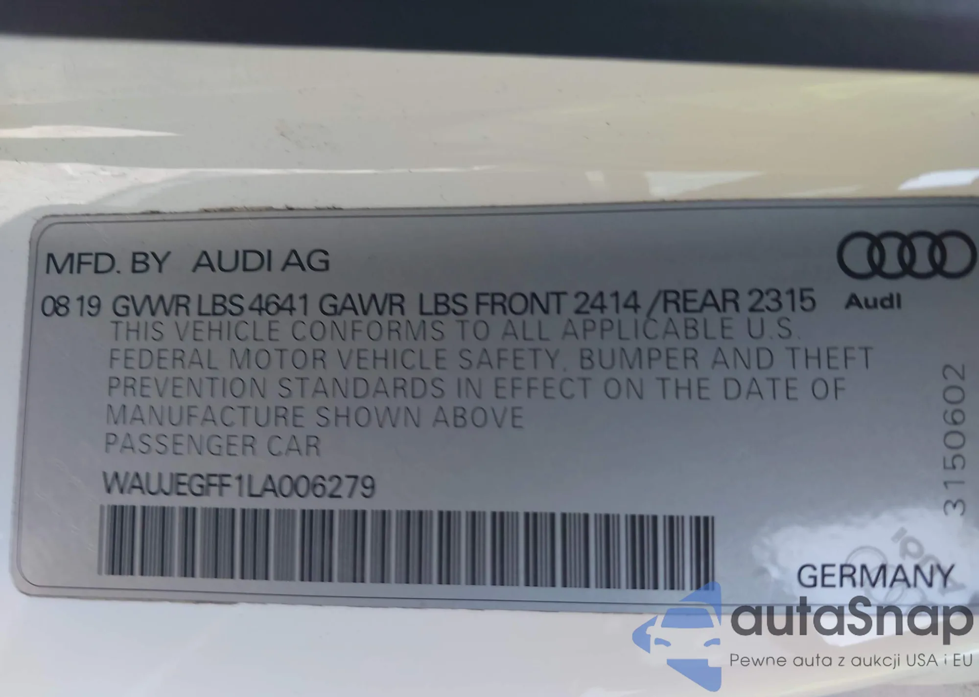 LOT: 43488493 VIN: WAUJEGFF1LA006279