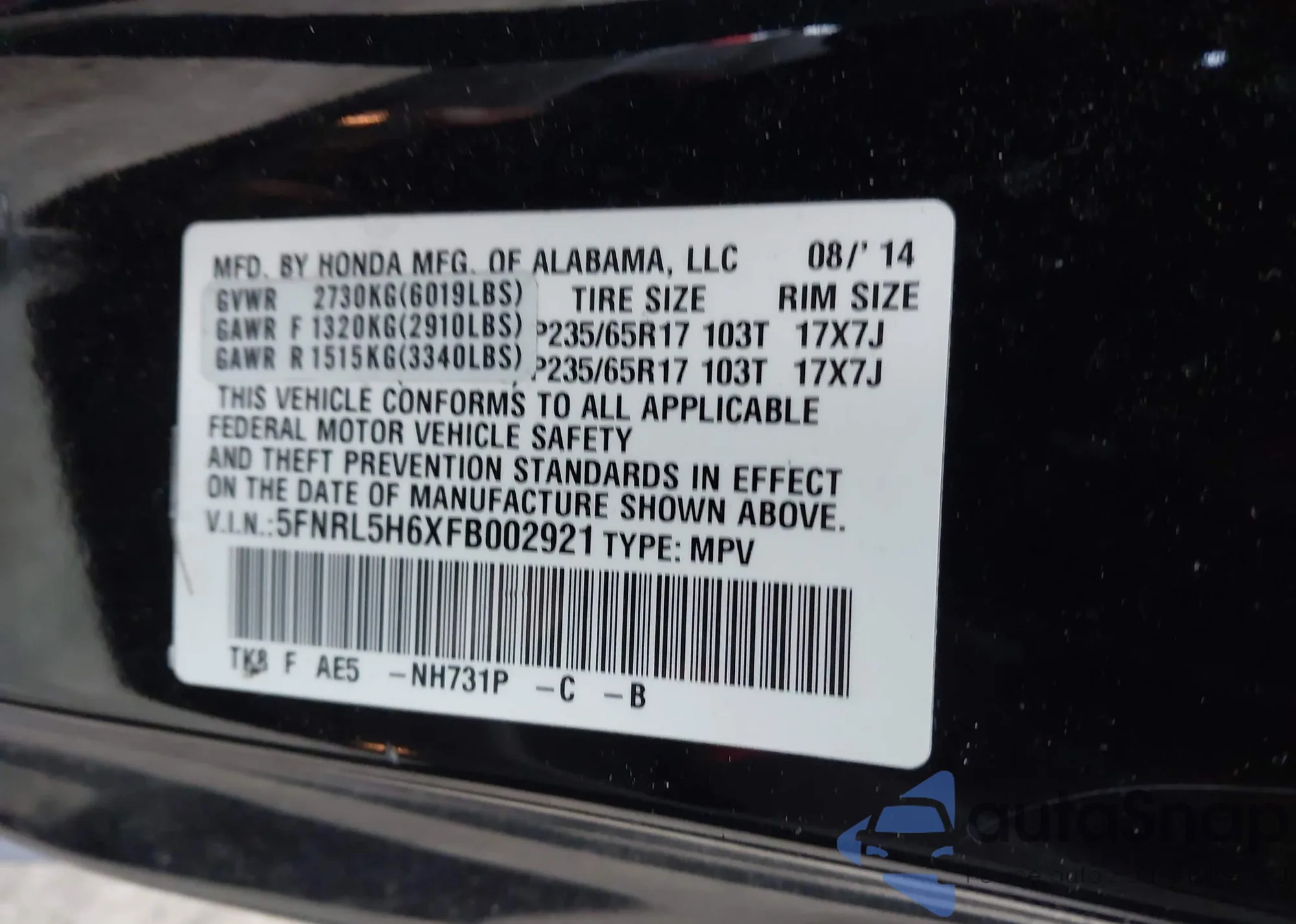 • VIN 5FNRL5H6XFB002921
