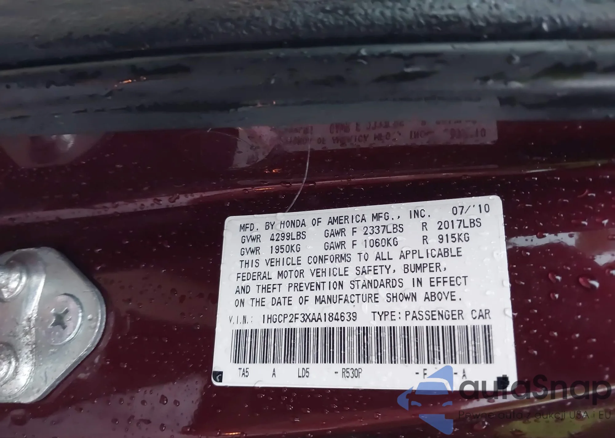 LOT: 43511812 VIN: 1HGCP2F3XAA184639